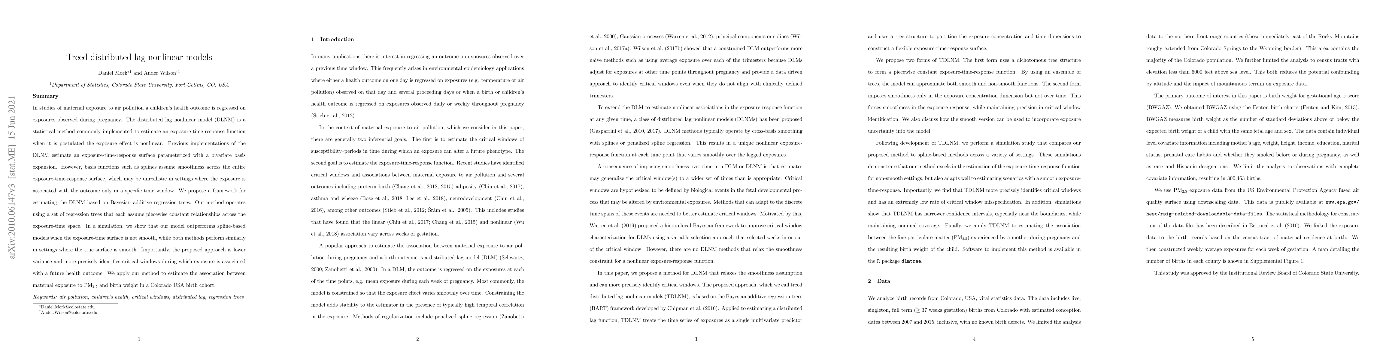 The research proposes a tree-based method for distributed lag nonlinear models (DLNM) to estimate the association between time-resolved pollution exposures and a continuous birth outcome, eliminating the smoothness assumption in the exposure-time response surface.