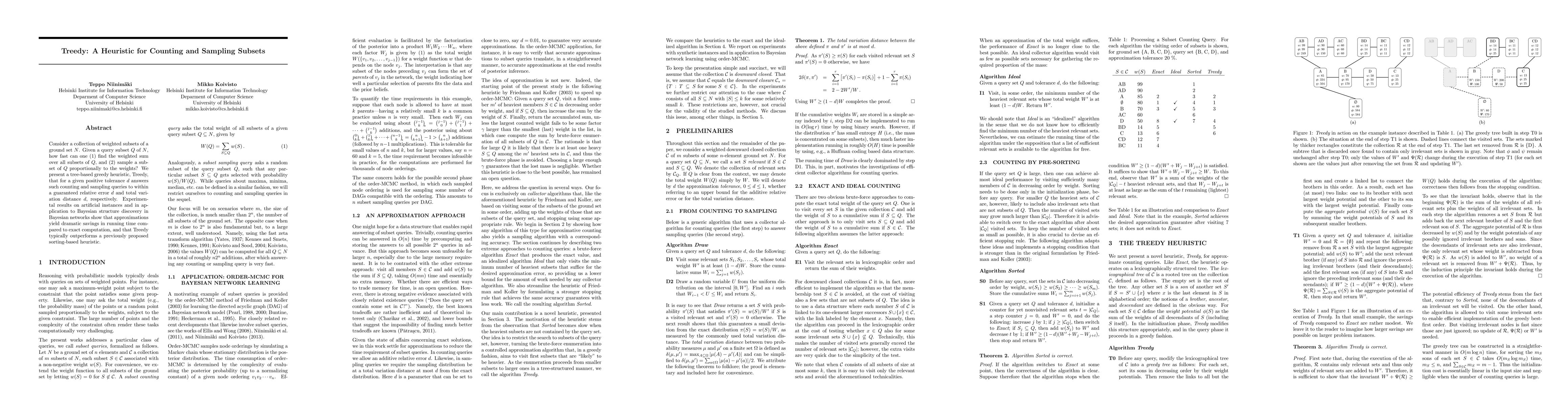 Treedy is a tree-based heuristic for efficiently counting and sampling weighted subsets within a given tolerance. It achieves significant speedups over exact methods and often outperforms a previous sorting-based heuristic, especially in Bayesian structure discovery applications.