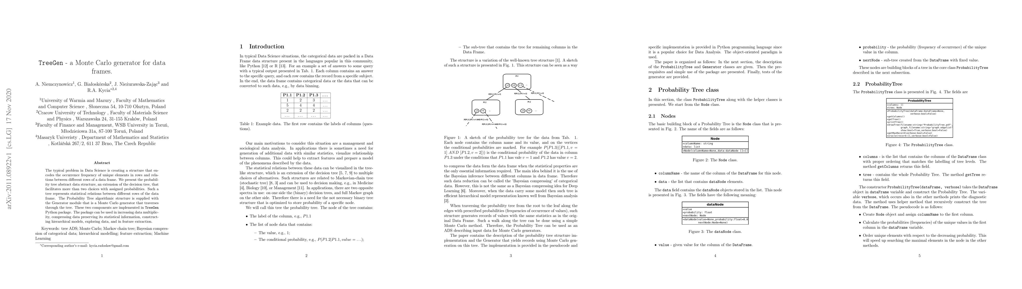 The typical problem in Data Science is creating a structure that encodes the occurrence frequency of unique elements in rows and relations between different rows of a data frame. We present the probability tree abstract data structure, an extension of the decision tree, that facilitates more than two choices with assigned probabilities. Such a tree represents statistical relations between different rows of the data frame. The Probability Tree algorithmic structure is supplied with the Generator module that is a Monte Carlo generator that traverses through the tree. These two components are implemented in TreeGen Python package. The package can be used in increasing data multiplicity, compressing data preserving its statistical information, constructing hierarchical models, exploring data, and in feature extraction.