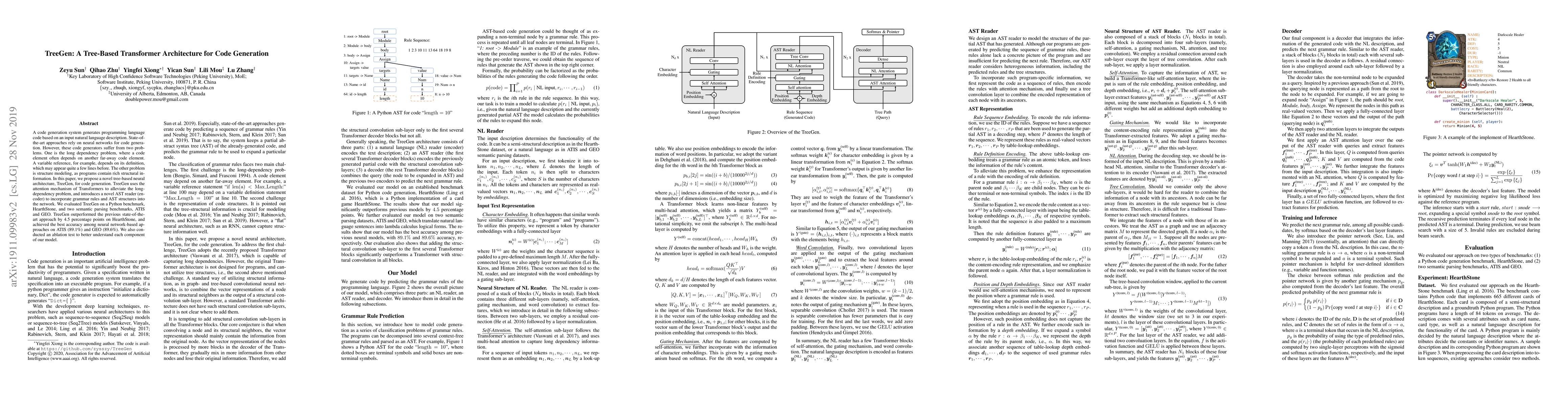 TreeGen is a novel tree-based Transformer architecture designed to address long dependency and structural modeling issues in code generation. It outperforms previous methods on multiple benchmarks, demonstrating improved accuracy by incorporating an AST reader and attention mechanism.