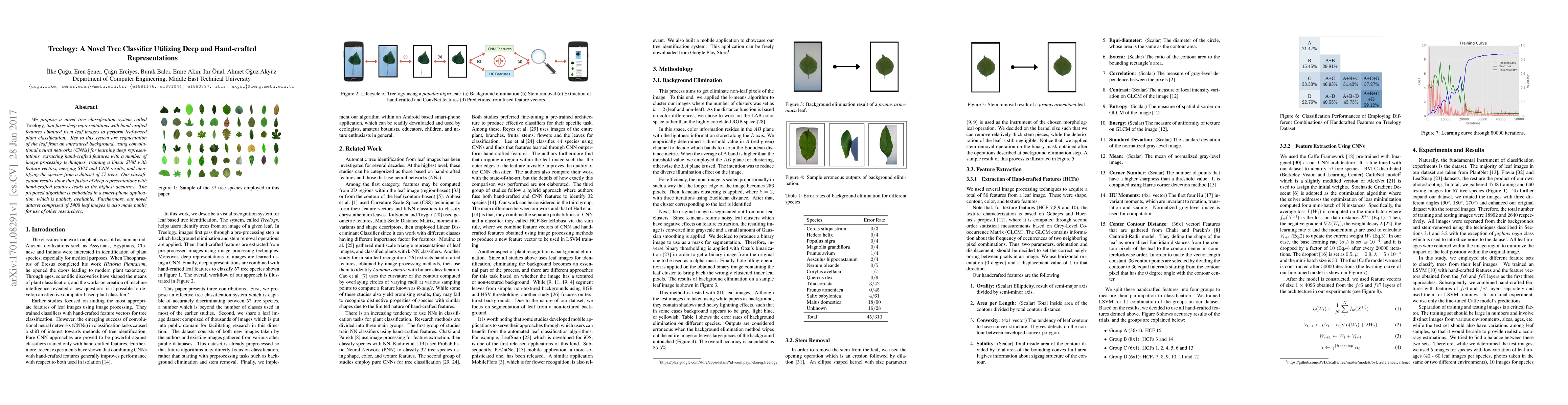 Treelogy is a novel tree classifier that combines deep learning and hand-crafted features from leaf images for plant classification. The system achieves high accuracy by fusing CNN-based deep representations with hand-crafted features and is embedded in a smartphone application, with a new dataset of 5408 leaf images made publicly available.
