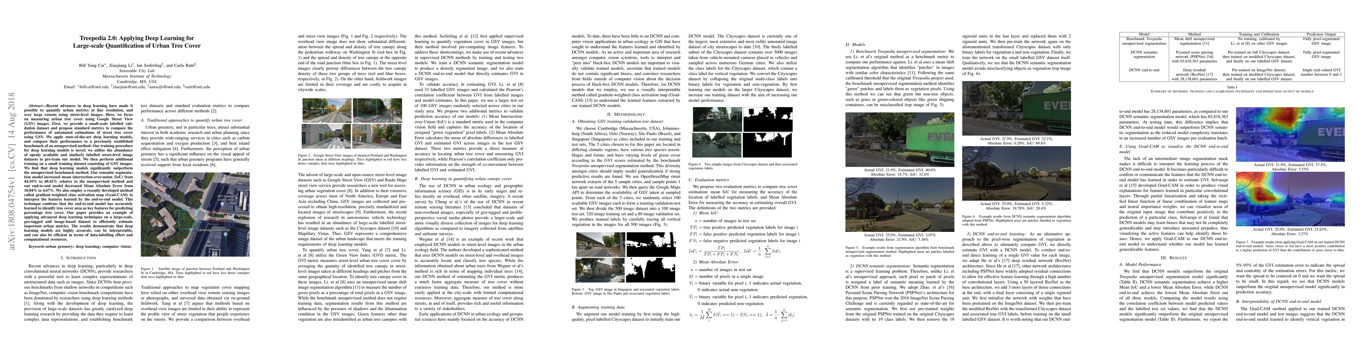This paper applies advanced deep learning techniques to quantify urban tree cover using Google Street View images, achieving significant improvements over an unsupervised benchmark method. The study demonstrates that deep learning models can efficiently estimate urban metrics, with a semantic segmentation model increasing mean intersection-over-union from 44.10% to 60.42%.