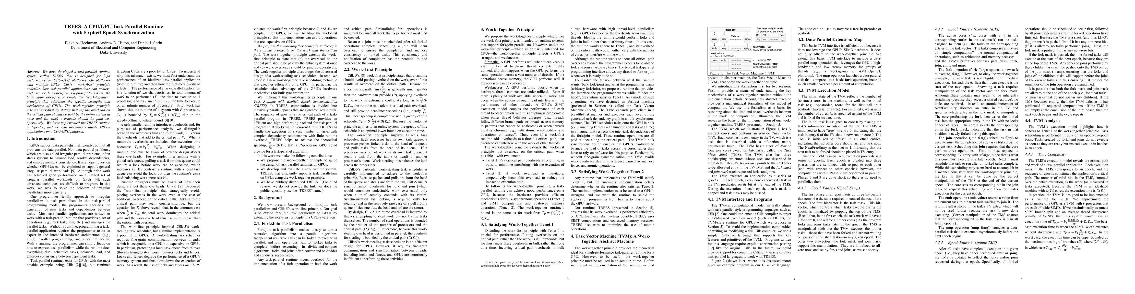 TREES is a task-parallel runtime system designed for high performance on CPU/GPU platforms, employing a "work-together" principle that optimizes GPU performance by ensuring overheads are co-operatively shared. The runtime was implemented in OpenCL and evaluated on a CPU/GPU platform.