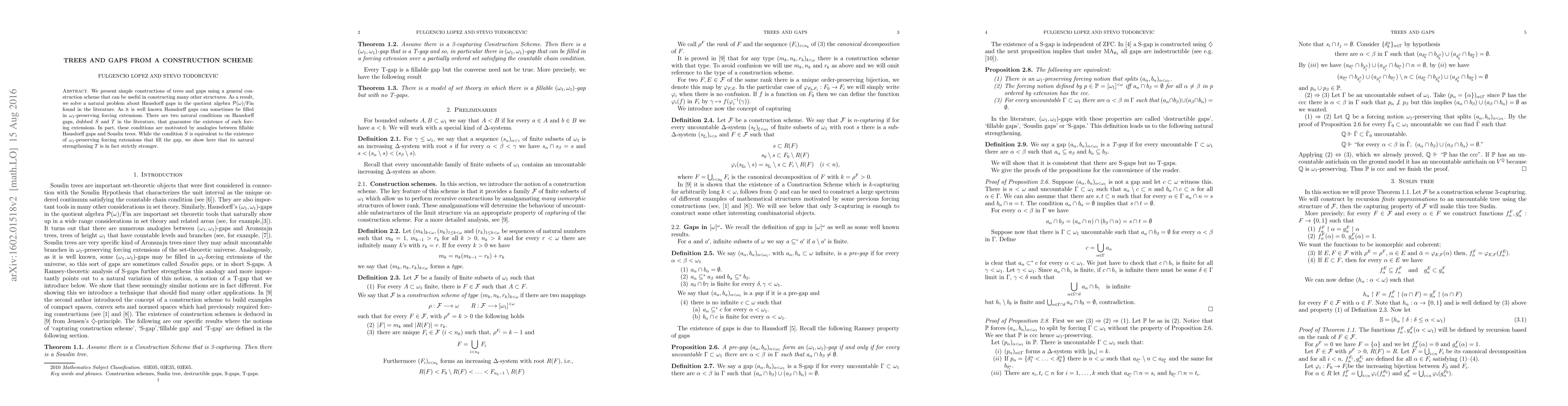 We present natural constructions of trees and gaps using a quite general construction scheme. In particular, we solve a natural problem about $(\omega_1, \omega_1)$-gaps. As it is well known $(\omega_1, \omega_1)$-gaps can sometimes be filled in $\omega_1$-preserving forcing extensions of the set-theoretic universe. There are two natural conditions, dubbed $S$ and $T$ below, that guarantee the existence of such forcing extensions. The condition $T$ is a natural strengthening of the condition $S$ and was motivated by the numerous analogies between $(\omega_1,\omega_1)$-gaps and certain trees of height $\omega_1.$ It turns out that the condition $S$ is in fact equivalent to the existence of such forcing extensions but we show that the condition $T$ is strictly stronger by proving that it is consistent that there are fillable $(\omega_1, \omega_1)$-gaps (i.e., S-gaps) but no T-gaps.