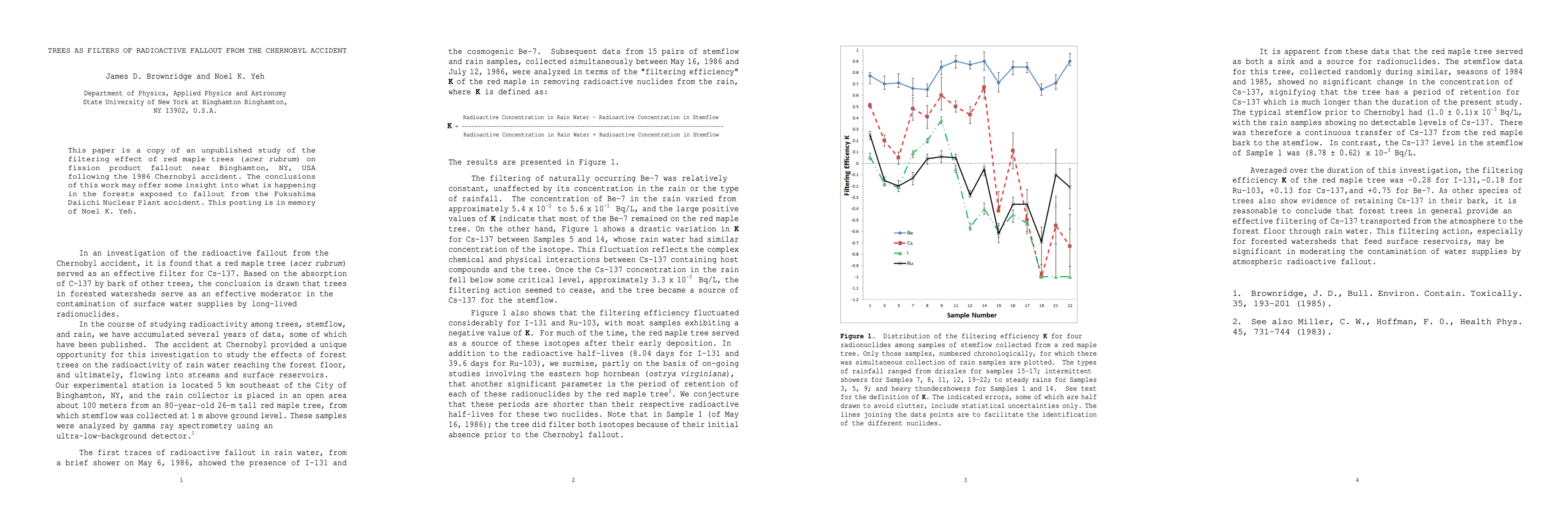 This study examines the filtering effect of red maple trees on radioactive fallout from the 1986 Chernobyl accident near Binghamton, NY, providing insights into similar processes in forests affected by the Fukushima Daiichi Nuclear Plant accident. The work honors the memory of Noel K. Yeh.