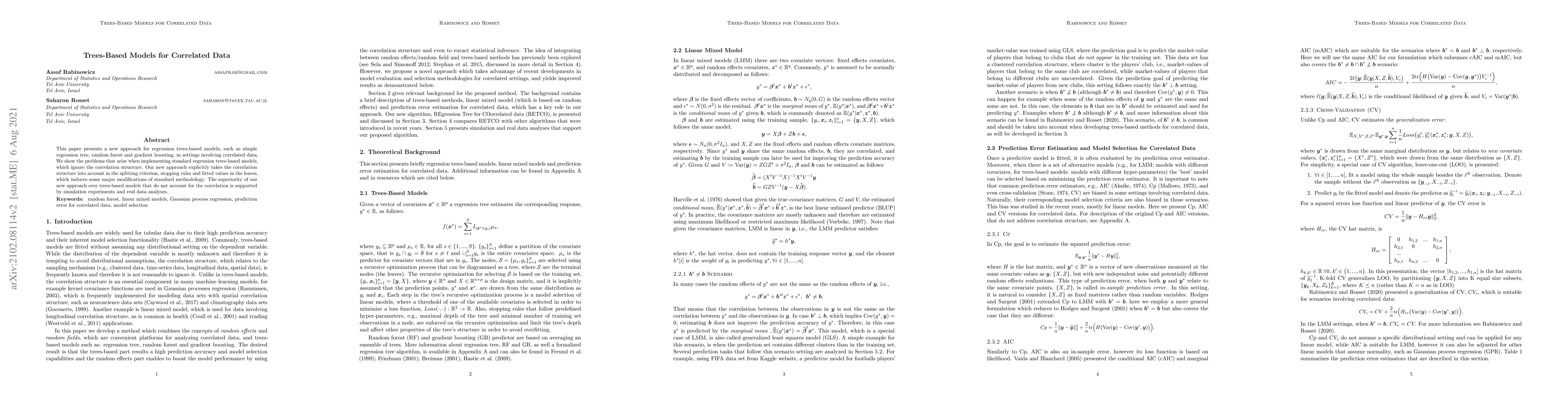 A new approach to trees-based regression models is presented, addressing the limitations of ignoring correlation structure in data, offering improved performance through explicit consideration of correlation.