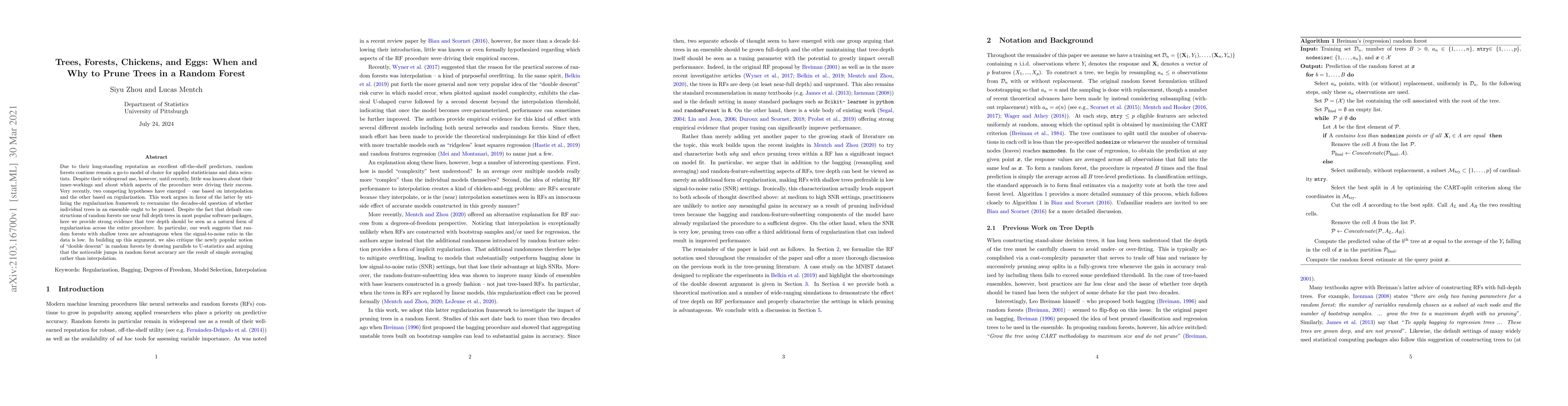 Due to their long-standing reputation as excellent off-the-shelf predictors, random forests continue remain a go-to model of choice for applied statisticians and data scientists. Despite their widespread use, however, until recently, little was known about their inner-workings and about which aspects of the procedure were driving their success. Very recently, two competing hypotheses have emerged -- one based on interpolation and the other based on regularization. This work argues in favor of the latter by utilizing the regularization framework to reexamine the decades-old question of whether individual trees in an ensemble ought to be pruned. Despite the fact that default constructions of random forests use near full depth trees in most popular software packages, here we provide strong evidence that tree depth should be seen as a natural form of regularization across the entire procedure. In particular, our work suggests that random forests with shallow trees are advantageous when the signal-to-noise ratio in the data is low. In building up this argument, we also critique the newly popular notion of "double descent" in random forests by drawing parallels to U-statistics and arguing that the noticeable jumps in random forest accuracy are the result of simple averaging rather than interpolation.