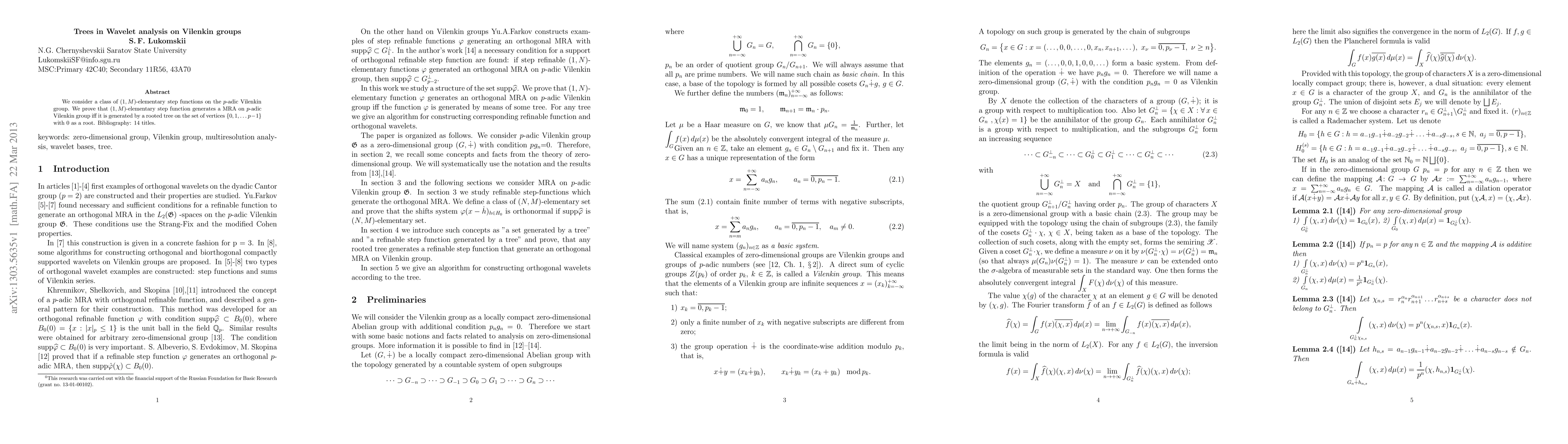 This paper investigates the generation of a Multiresolution Analysis (MRA) on the $p$-adic Vilenkin group by $(1,M)$-elementary step functions, proving that such functions generate an MRA if and only if they are associated with a rooted tree on the set $\{0,1,\dots,p-1\}$ with 0 as the root. The study references 14 titles to support its findings.