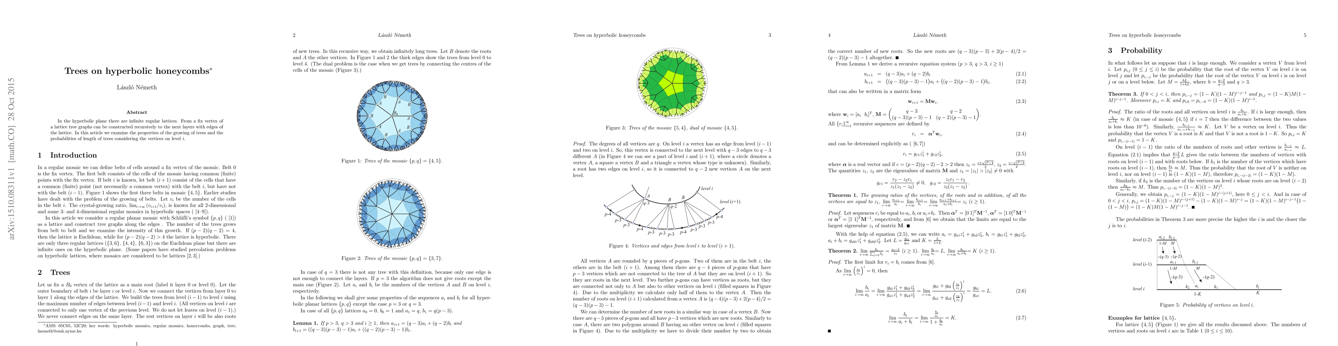 The paper presents a recursive equation system and matrix representation for analyzing tree growth on hyperbolic honeycombs, along with probability expressions for vertex roots.