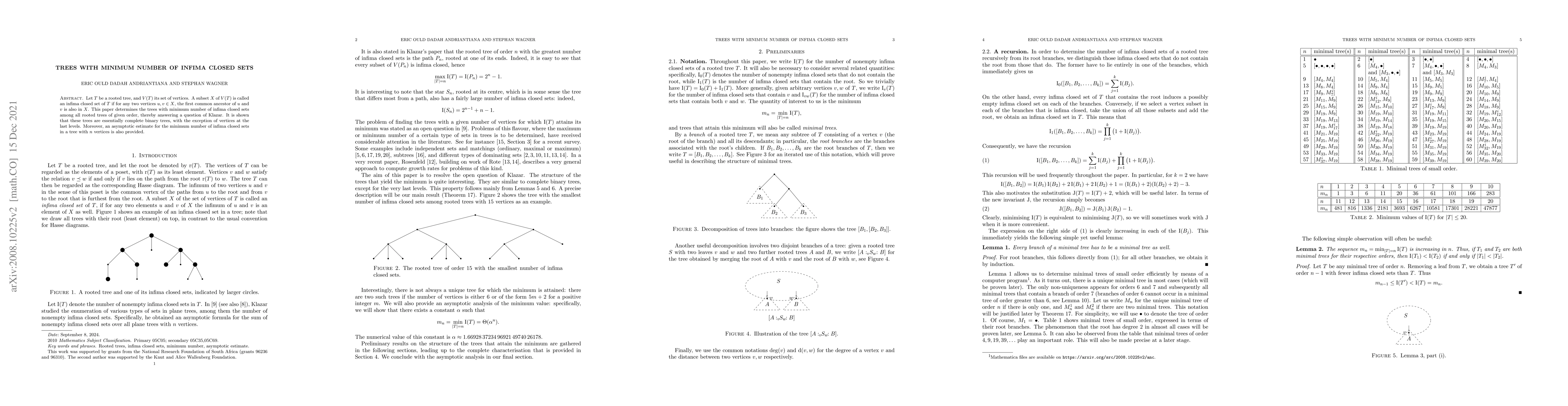 The paper finds that trees with minimum number of infima closed sets are essentially complete binary trees, except for the last level vertices. It also provides an asymptotic estimate for the minimum number of infima closed sets in a tree with n vertices.
