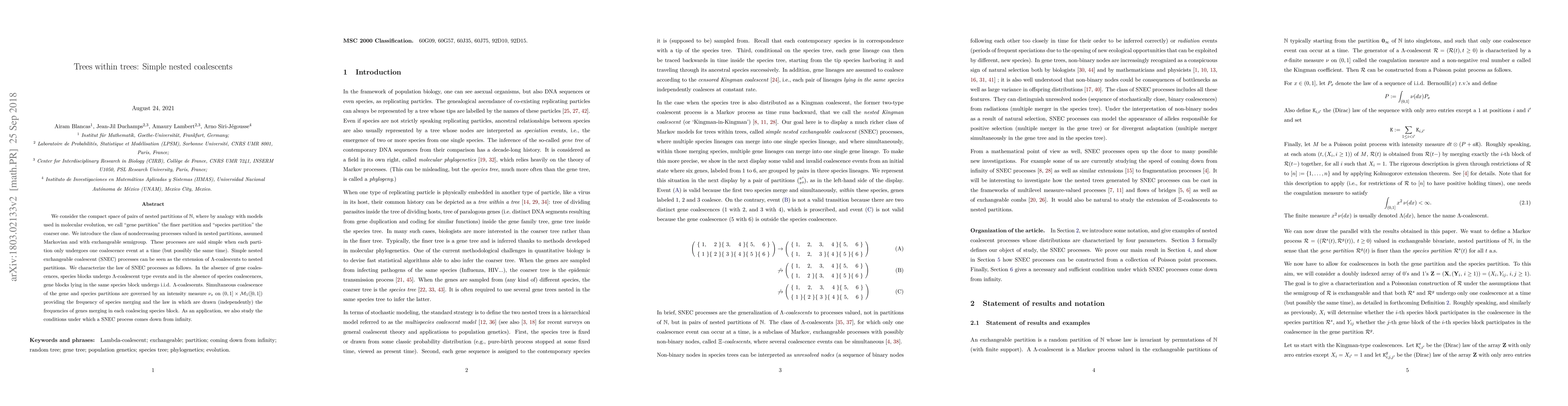 This paper introduces simple nested exchangeable coalescent (SNEC) processes, which extend $\Lambda$-coalescents to nested partitions, modeling gene and species partitions. It characterizes the law of SNEC processes, detailing how gene and species blocks undergo coalescent events independently and how simultaneous coalescence is governed by an intensity measure.
