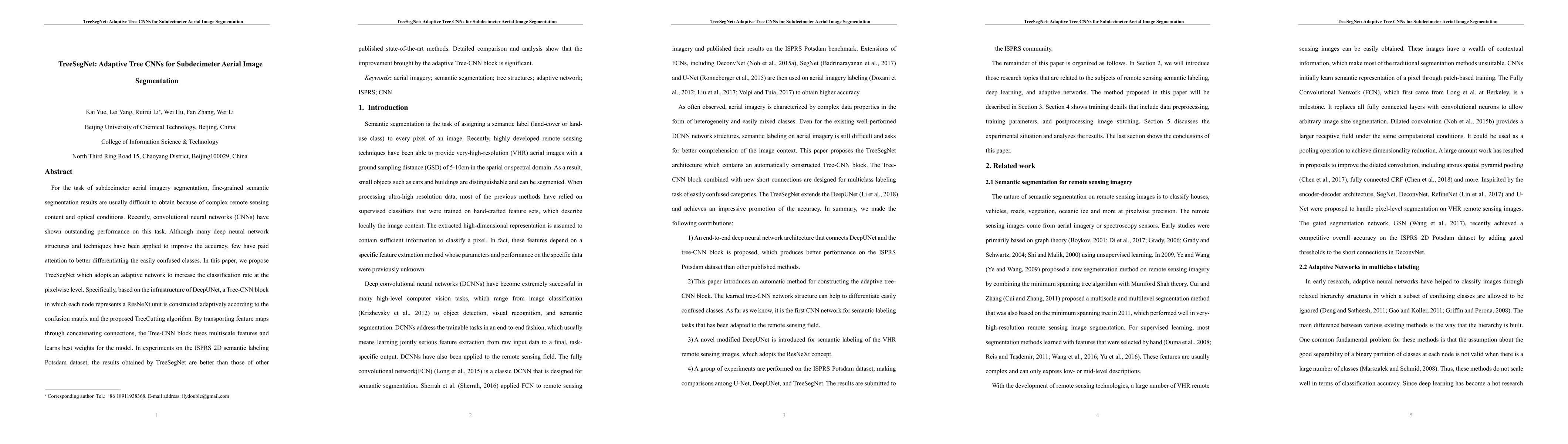TreeSegNet introduces an adaptive Tree-CNN block based on DeepUNet to enhance pixelwise segmentation accuracy in subdecimeter aerial imagery. The Tree-CNN block, utilizing ResNeXt units and multiscale feature fusion, significantly outperforms other methods on the ISPRS Potsdam dataset.