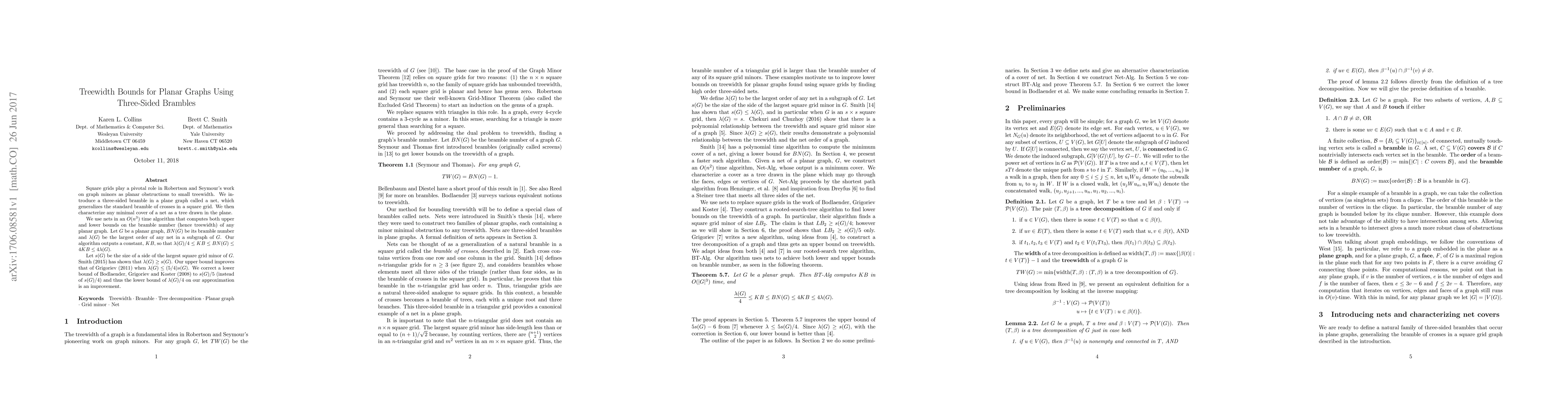 Square grids play a pivotal role in Robertson and Seymour's work on graph minors as planar obstructions to small treewidth. We introduce a three-sided bramble in a plane graph called a net, which generalizes the standard bramble of crosses in a square grid. We then characterize any minimal cover of a net as a tree drawn in the plane. We use nets in an $O(n^3)$ time algorithm that computes both upper and lower bounds on the bramble number (hence treewidth) of any planar graph. Let $G$ be a planar graph, $BN(G)$ be its bramble number and $\lambda(G)$ be the largest order of any net in a subgraph of $G$. Our algorithm outputs a constant, $KB$, so that $\lambda(G)/4 \leq KB \leq BN(G)\leq 4KB \leq 4\lambda(G)$. Let $s(G)$ be the size of a side of the largest square grid minor of $G$. Smith (2015) has shown that $\lambda(G) \geq s(G)$. Our upper bound improves that of Grigoriev (2011) when $\lambda(G)\leq (5/4)s(G)$. We correct a lower bound of Bodlaender, Grigoriev and Koster (2008) to $s(G)/5$ (instead of $s(G)/4$) and thus the lower bound of $\lambda(G)/4$ on our approximation is an improvement.