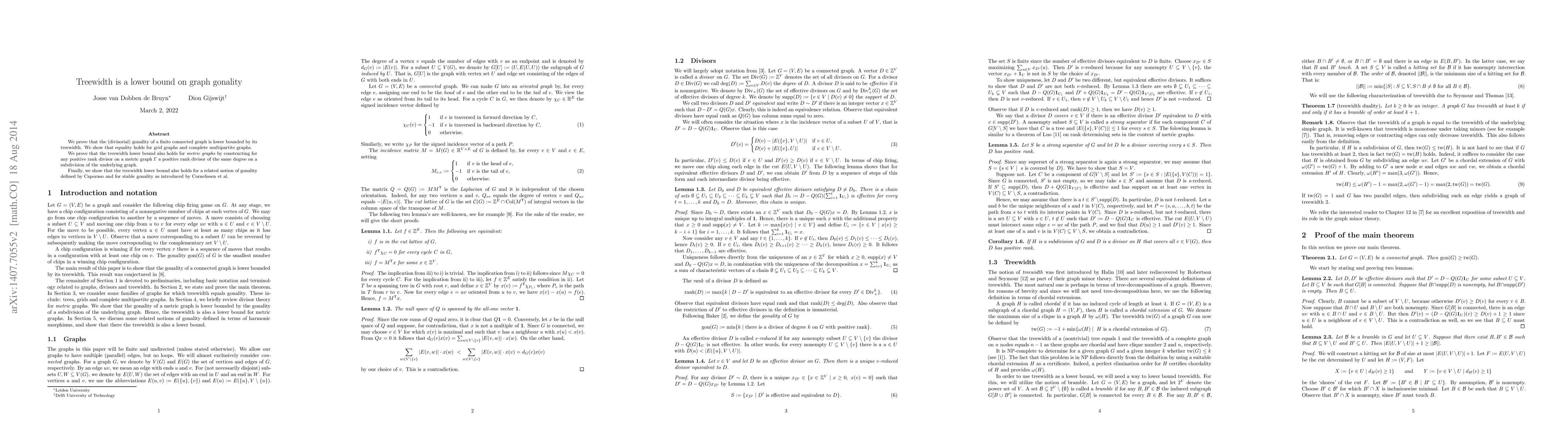 This paper establishes that the gonality of a finite connected graph is lower bounded by its treewidth, with equality for grid graphs and complete multipartite graphs. It extends this result to metric graphs by constructing positive rank divisors on subdivisions, and also applies the treewidth lower bound to related notions of gonality.