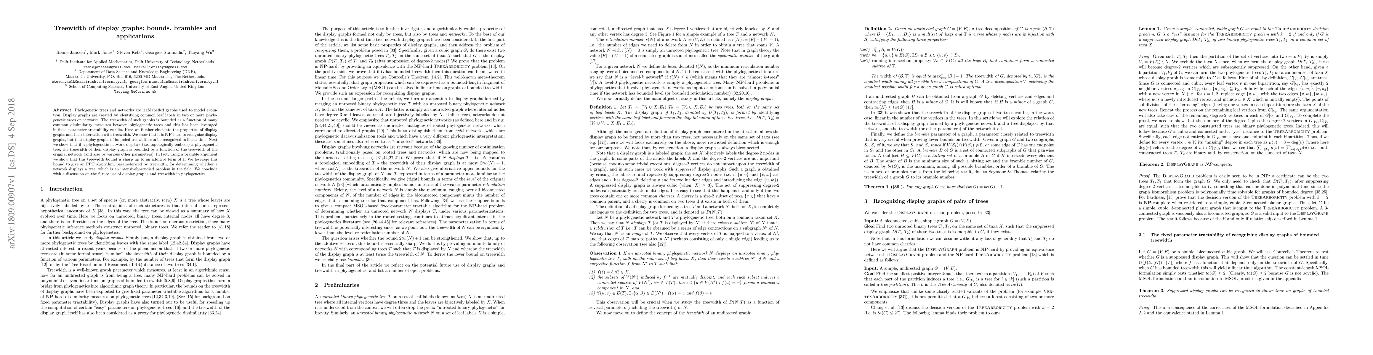 Research on display graphs reveals that their treewidth can be bounded as a function of common dissimilarity measures between phylogenetic trees, enabling fixed parameter tractability results and applications in phylogenetics.