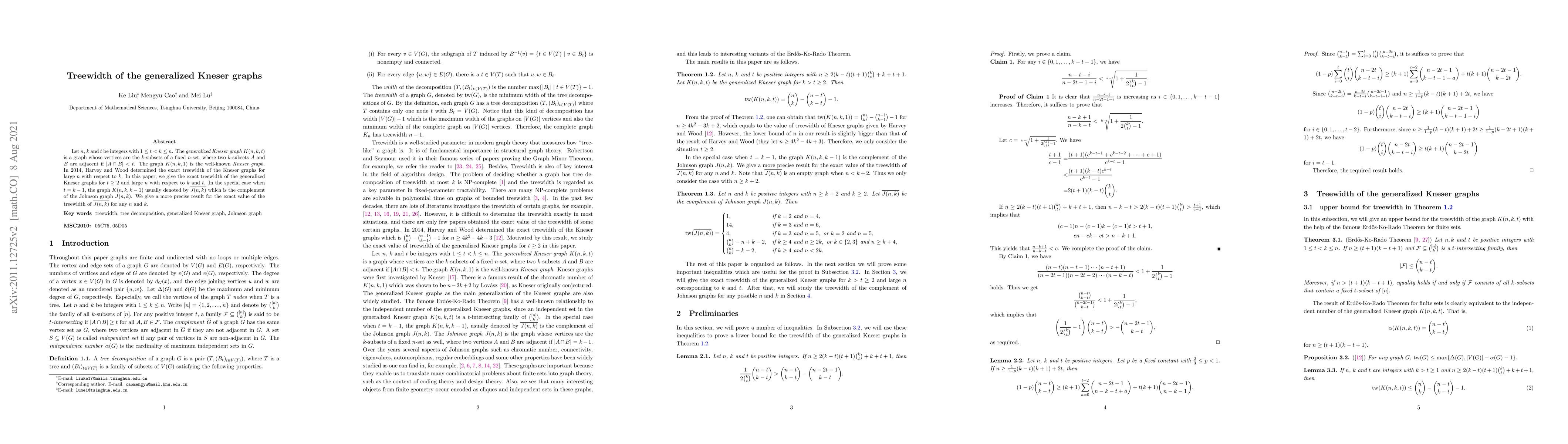 Let $n$, $k$ and $t$ be integers with $1\leq t< k \leq n$. The