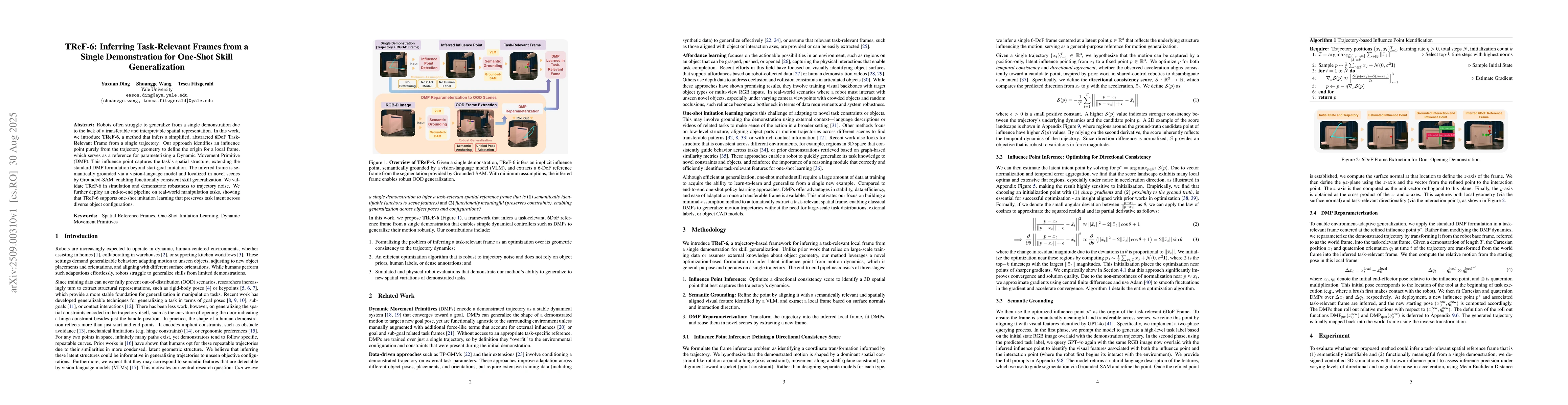 Robots often struggle to generalize from a single demonstration due to the lack of a transferable and interpretable spatial representation. In this work, we introduce TReF-6, a method that infers a simplified, abstracted 6DoF Task-Relevant Frame from a single trajectory. Our approach identifies an influence point purely from the trajectory geometry to define the origin for a local frame, which serves as a reference for parameterizing a Dynamic Movement Primitive (DMP). This influence point captures the task's spatial structure, extending the standard DMP formulation beyond start-goal imitation. The inferred frame is semantically grounded via a vision-language model and localized in novel scenes by Grounded-SAM, enabling functionally consistent skill generalization. We validate TReF-6 in simulation and demonstrate robustness to trajectory noise. We further deploy an end-to-end pipeline on real-world manipulation tasks, showing that TReF-6 supports one-shot imitation learning that preserves task intent across diverse object configurations.