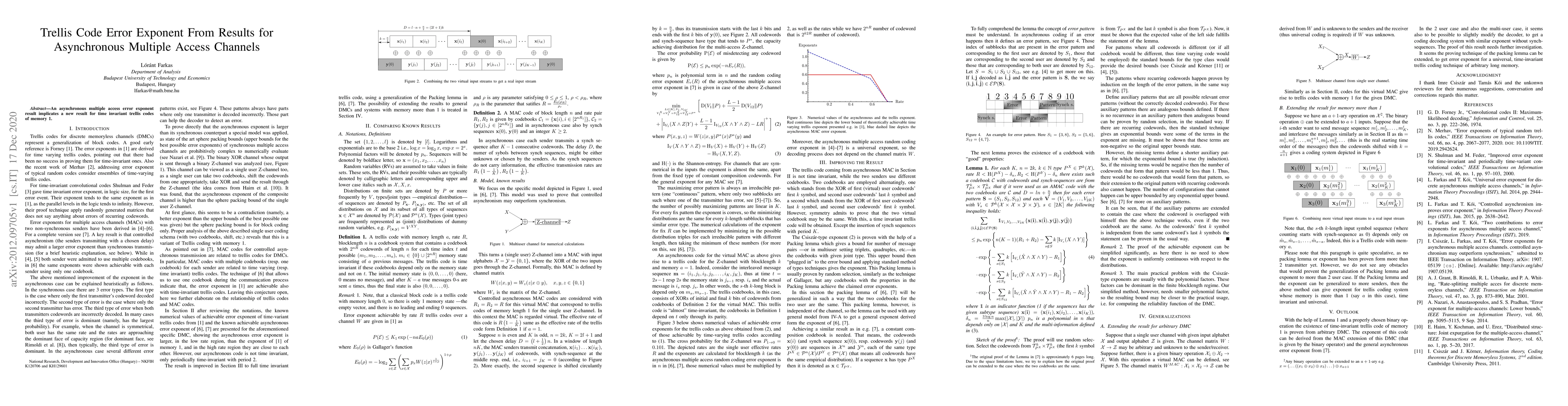 Summary: This paper presents an error exponent result for asynchronous multiple access channels using time invariant trellis codes of memory 1, introducing a new insight into the system's performance.