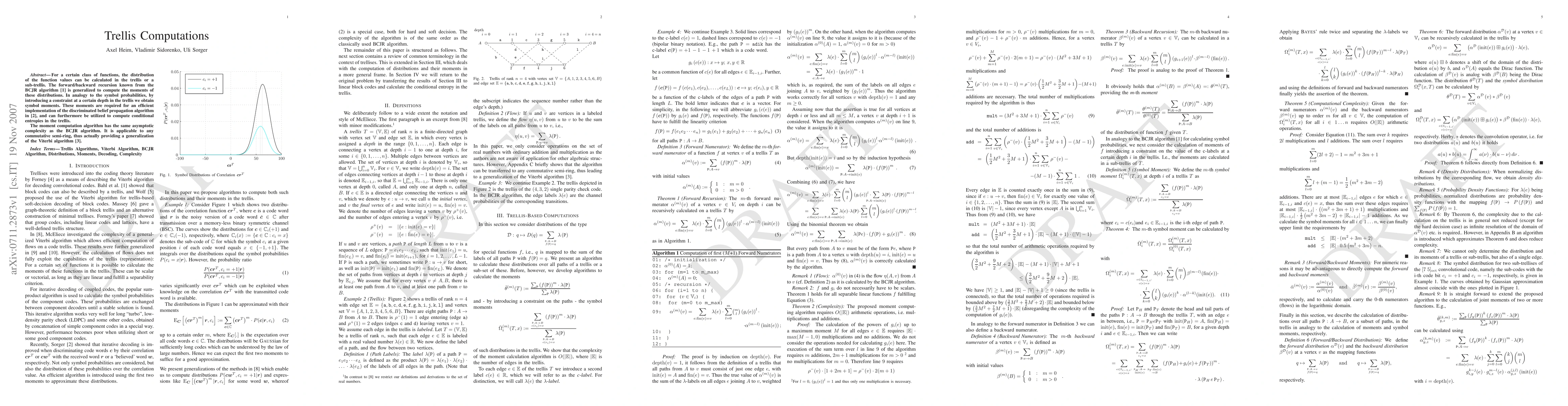 For a certain class of functions, the distribution of the function values can be calculated in the trellis or a sub-trellis. The forward/backward recursion known from the BCJR algorithm is generalized to compute the moments of these distributions. In analogy to the symbol probabilities, by introducing a constraint at a certain depth in the trellis we obtain symbol moments. These moments are required for an efficient implementation of the discriminated belief propagation algorithm in [2], and can furthermore be utilized to compute conditional entropies in the trellis. The moment computation algorithm has the same asymptotic complexity as the BCJR algorithm. It is applicable to any commutative semi-ring, thus actually providing a generalization of the Viterbi algorithm.