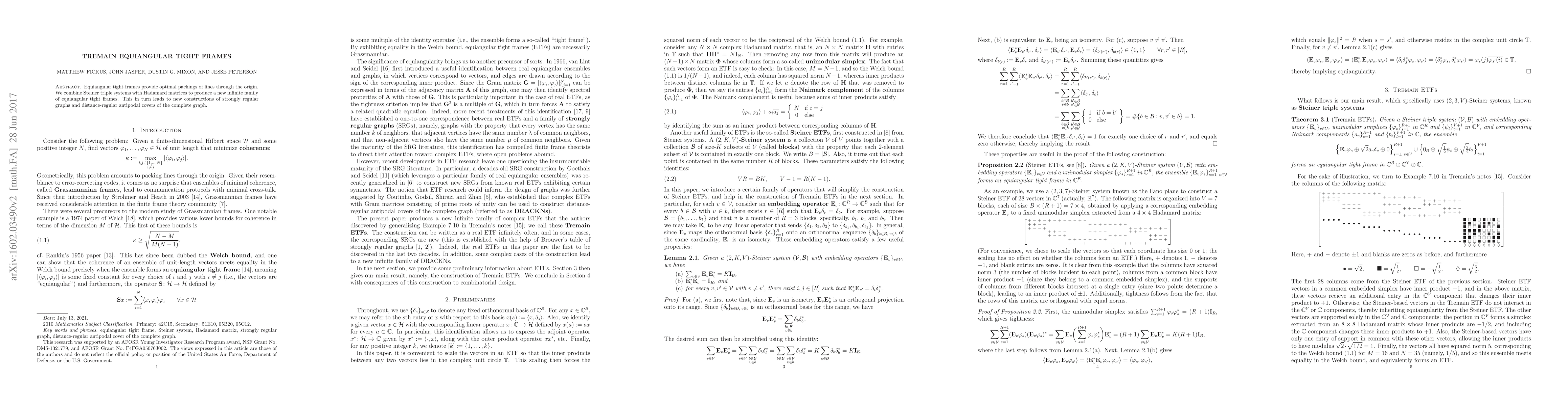 The paper introduces a novel method to generate equiangular tight frames using Steiner triple systems and Hadamard matrices, leading to new constructions of strongly regular graphs and distance-regular antipodal covers of the complete graph.