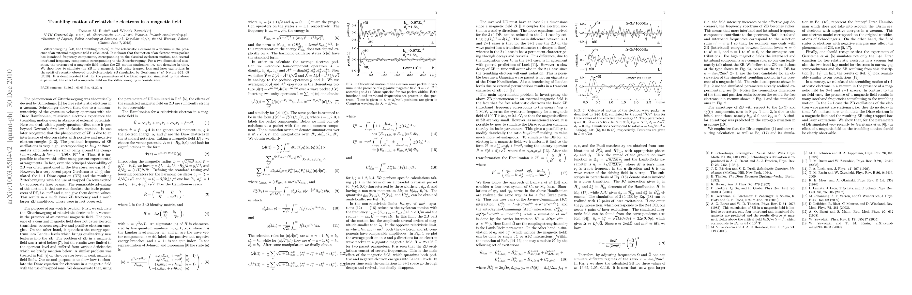 This paper calculates the Zitterbewegung of relativistic electrons in a vacuum under an external magnetic field, revealing intraband and interband frequency components. It demonstrates that the magnetic field can make the Zitterbewegung stationary in two dimensions and discusses simulating this phenomenon using trapped ions and laser excitations.