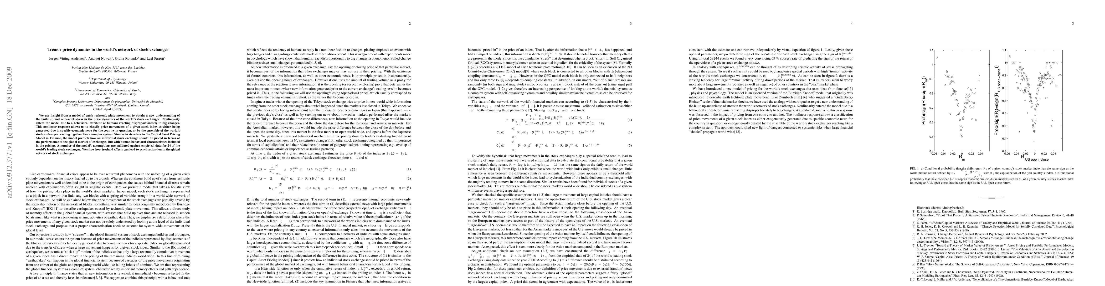 We use insight from a model of earth tectonic plate movement to obtain a new understanding of the build up and release of stress in the price dynamics of the worlds stock exchanges. Nonlinearity enters the model due to a behavioral attribute of humans reacting disproportionately to big changes. This nonlinear response allows us to classify price movements of a given stock index as either being generated due to specific economic news for the country in question, or by the ensemble of the worlds stock exchanges reacting together like a complex system. Similar in structure to the Capital Asset Pricing Model in Finance, the model predicts how an individual stock exchange should be priced in terms of the performance of the global market of exchanges, but with human behavioral characteristics included in the pricing. A number of the models assumptions are validated against empirical data for 24 of the worlds leading stock exchanges. We show how treshold effects can lead to synchronization in the global network of stock exchanges.