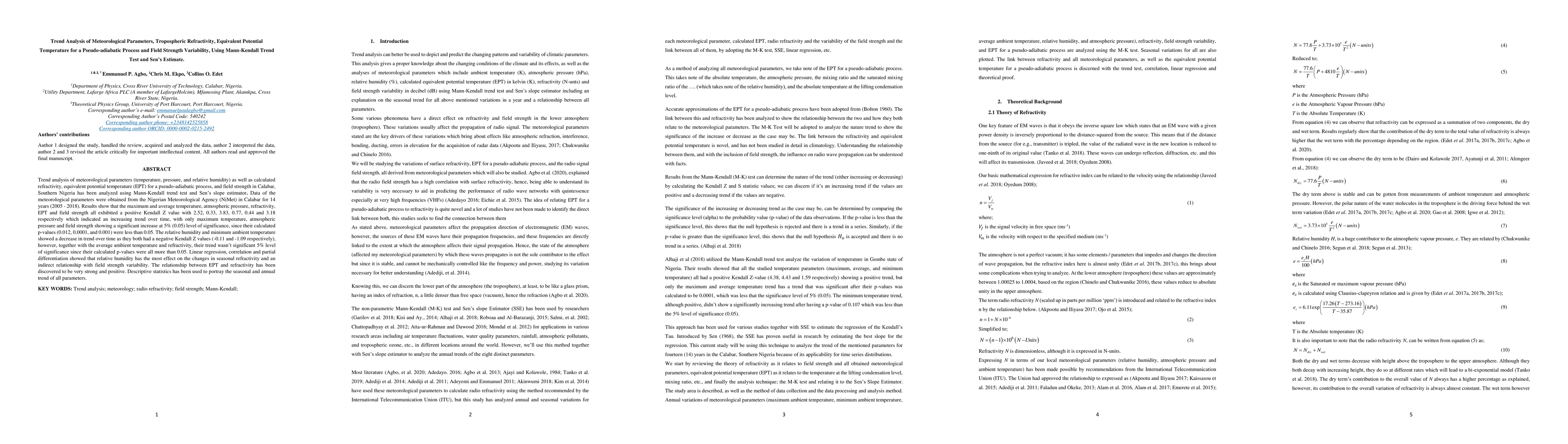 Trend analysis of meteorological parameters (temperature, pressure, and relative humidity) as well as calculated refractivity, equivalent potential temperature (EPT) for a pseudo-adiabatic process, and field strength in Calabar, Southern Nigeria has been analyzed using Mann-Kendall trend test and Sens slope estimator. Data of the meteorological parameters were obtained from the Nigerian Meteorological Agency (NiMet) in Calabar for 14 years (2005 - 2018). Results show that the maximum and average temperature, atmospheric pressure, refractivity, EPT and field strength all exhibited a positive Kendall Z value with 2.52, 0.33, 3.83, 0.77, 0.44 and 3.18 respectively which indicated an increasing trend over time, with only maximum temperature, atmospheric pressure and field strength showing a significant increase at 5% (0.05) level of significance, since their calculated p-values (0.012, 0.0001, and 0.001) were less than 0.05. The relative humidity and minimum ambient temperature showed a decrease in trend over time as they both had a negative Kendall Z values (-0.11 and -1.09 respectively), however, together with the average ambient temperature and refractivity, their trend was not significant 5% level of significance since their calculated p-values were all more than 0.05. Linear regression, correlation and partial differentiation showed that relative humidity has the most effect on the changes in seasonal refractivity and an indirect relationship with field strength variability. The relationship between EPT and refractivity has been discovered to be very strong and positive. Descriptive statistics has been used to portray the seasonal and annual trend of all parameters.