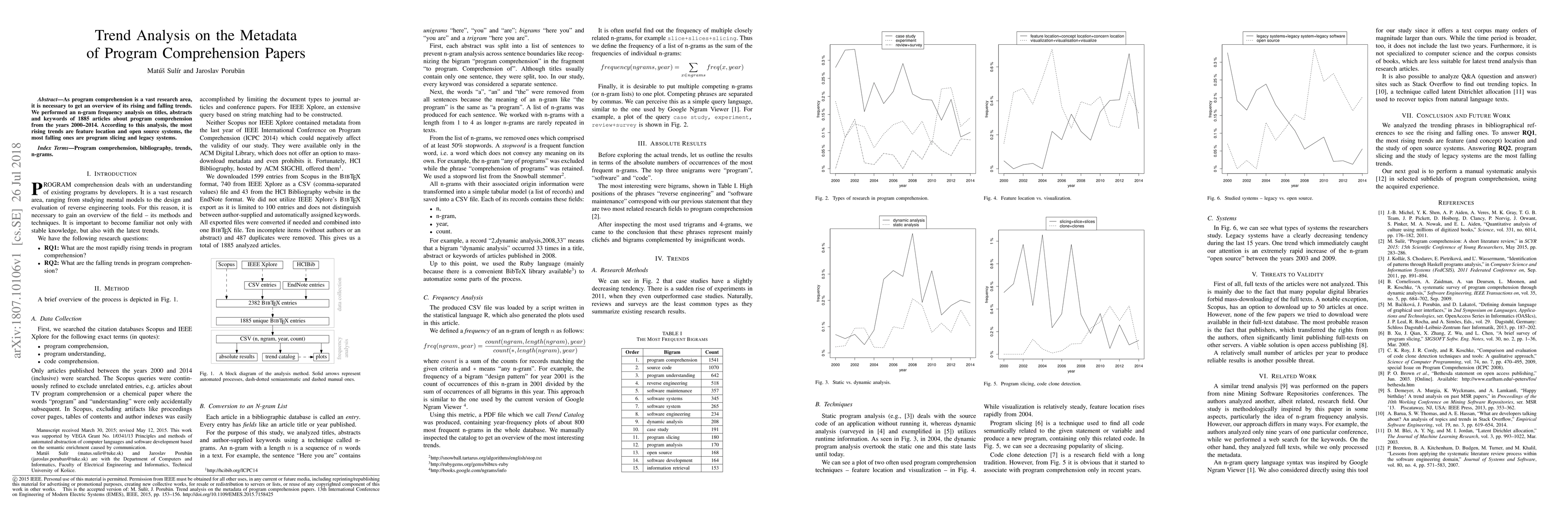 A study analyzed 1885 program comprehension papers from 2000-2014, finding rising trends in feature location and open source systems, while declining topics include program slicing and legacy systems.
