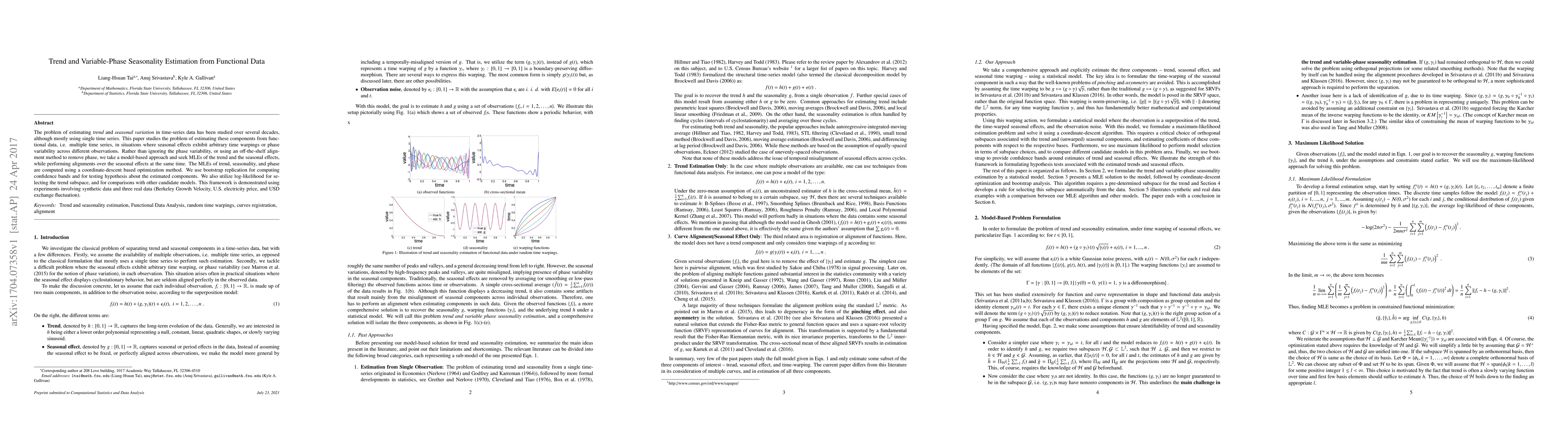 The problem of estimating trend and seasonal variation in time-series data has been studied over several decades, although mostly using single time series. This paper studies the problem of estimating these components from functional data, i.e. multiple time series, in situations where seasonal effects exhibit arbitrary time warpings or phase variability across different observations. Rather than ignoring the phase variability, or using an off-the-shelf alignment method to remove phase, we take a model-based approach and seek MLEs of the trend and the seasonal effects, while performing alignments over the seasonal effects at the same time. The MLEs of trend, seasonality, and phase are computed using a coordinate-descent based optimization method. We use bootstrap replication for computing confidence bands and for testing hypothesis about the estimated components. We also utilize log-likelihood for selecting the trend subspace, and for comparisons with other candidate models. This framework is demonstrated using experiments involving synthetic data and three real data (Berkeley Growth Velocity, U.S. electricity price, and USD exchange fluctuation).