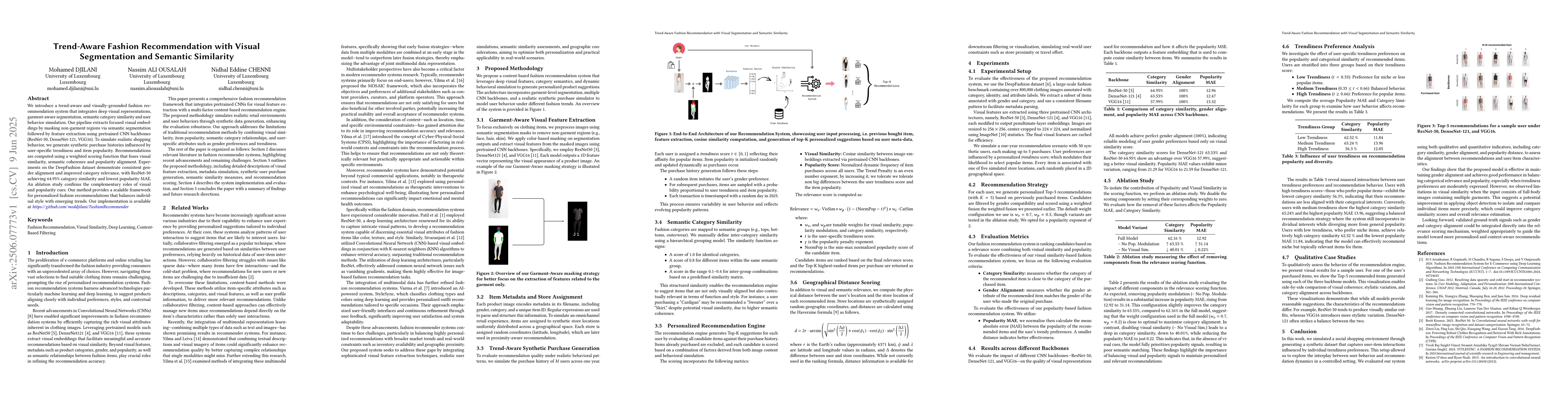 A trend-aware fashion recommendation system that balances individual style with emerging trends uses deep visual representations, garment segmentation, semantic category similarity, and user behavior simulation to improve personalized recommendations.