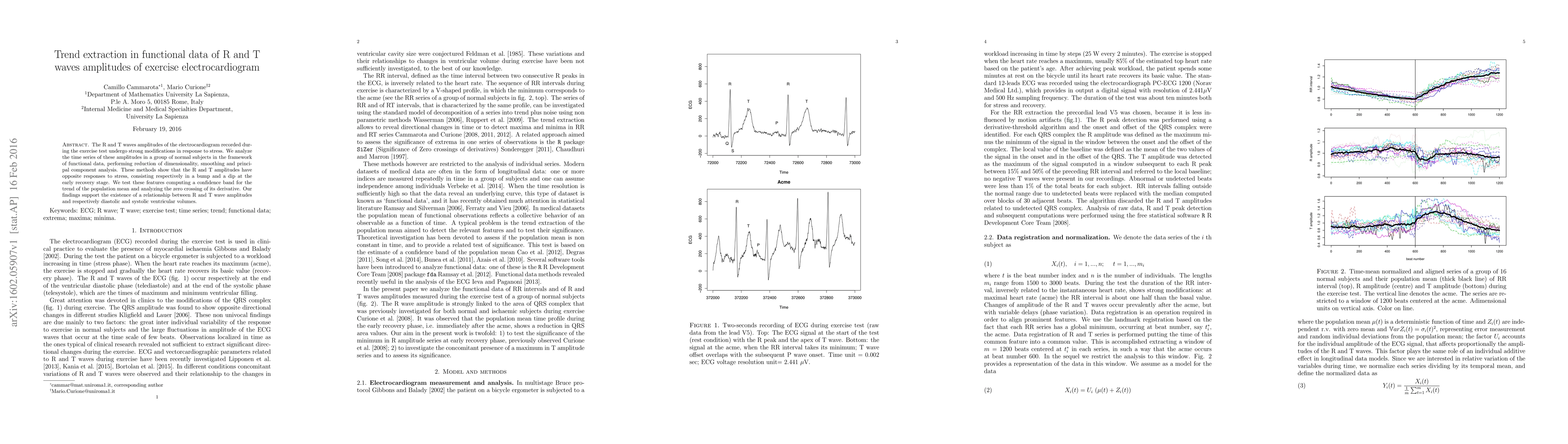 The R and T waves amplitudes of the electrocardiogram recorded during the exercise test undergo strong modifications in response to stress. We analyze the time series of these amplitudes in a group of normal subjects in the framework of functional data, performing reduction of dimensionality, smoothing and principal component analysis. These methods show that the R and T amplitudes have opposite responses to stress, consisting respectively in a bump and a dip at the early recovery stage. We test these features computing a confidence band for the trend of the population mean and analyzing the zero crossing of its derivative. Our findings support the existence of a relationship between R and T wave amplitudes and respectively diastolic and systolic ventricular volumes.