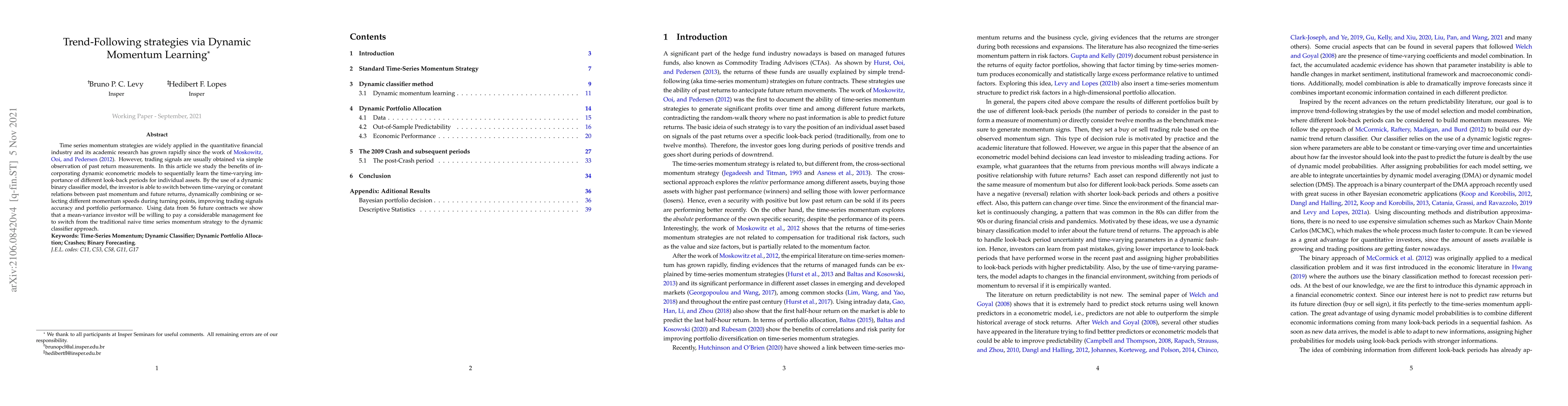 Time series momentum strategies are widely applied in the quantitative financial industry and its academic research has grown rapidly since the work of Moskowitz, Ooi and Pedersen (2012). However, trading signals are usually obtained via simple observation of past return measurements. In this article we study the benefits of incorporating dynamic econometric models to sequentially learn the time-varying importance of different look-back periods for individual assets. By the use of a dynamic binary classifier model, the investor is able to switch between time-varying or constant relations between past momentum and future returns, dynamically combining or selecting different momentum speeds during turning points, improving trading signals accuracy and portfolio performance. Using data from 56 future contracts we show that a mean-variance investor will be willing to pay a considerable management fee to switch from the traditional naive time series momentum strategy to the dynamic classifier approach.