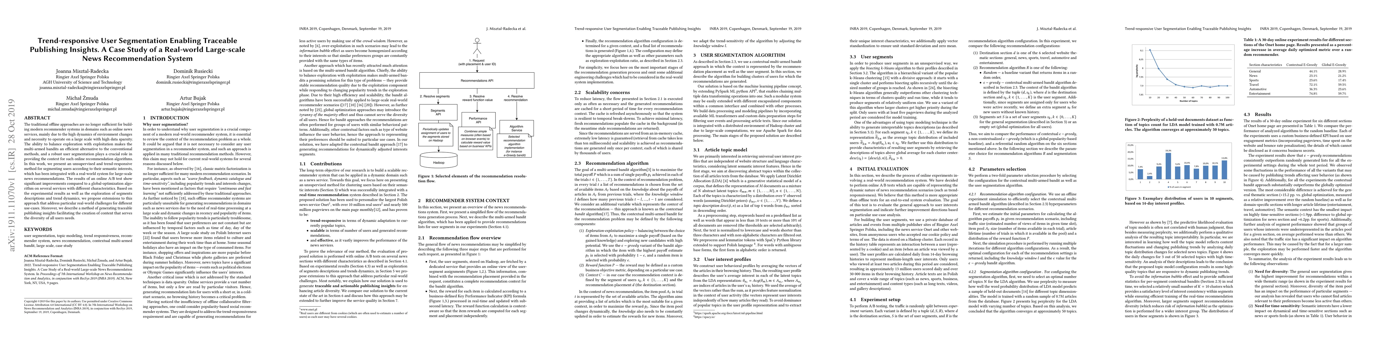 The traditional offline approaches are no longer sufficient for building modern recommender systems in domains such as online news services, mainly due to the high dynamics of environment changes and necessity to operate on a large scale with high data sparsity. The ability to balance exploration with exploitation makes the multi-armed bandits an efficient alternative to the conventional methods, and a robust user segmentation plays a crucial role in providing the context for such online recommendation algorithms. In this work, we present an unsupervised and trend-responsive method for segmenting users according to their semantic interests, which has been integrated with a real-world system for large-scale news recommendations. The results of an online A/B test show significant improvements compared to a global-optimization algorithm on several services with different characteristics. Based on the experimental results as well as the exploration of segments descriptions and trend dynamics, we propose extensions to this approach that address particular real-world challenges for different use-cases. Moreover, we describe a method of generating traceable publishing insights facilitating the creation of content that serves the diversity of all users needs.