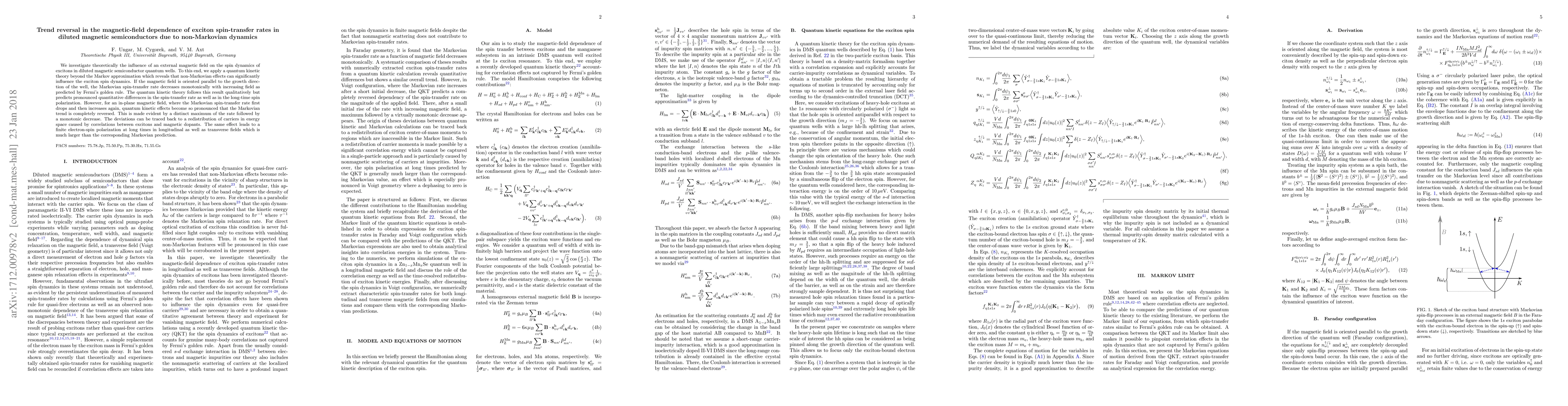 We investigate theoretically the influence of an external magnetic field on the spin dynamics of excitons in diluted magnetic semiconductor quantum wells. To this end, we apply a quantum kinetic theory beyond the Markov approximation which reveals that non-Markovian effects can significantly influence the exciton spin dynamics. If the magnetic field is oriented parallel to the growth direction of the well, the Markovian spin-transfer rate decreases monotonically with increasing field as predicted by Fermi's golden rule. The quantum kinetic theory follows this result qualitatively but predicts pronounced quantitative differences in the spin-transfer rate as well as in the long-time spin polarization. However, for an in-plane magnetic field, where the Markovian spin-transfer rate first drops and then increases again, quantum kinetic effects become so pronounced that the Markovian trend is completely reversed. This is made evident by a distinct maximum of the rate followed by a monotonic decrease. The deviations can be traced back to a redistribution of carriers in energy space caused by correlations between excitons and magnetic dopants. The same effect leads to a finite electron-spin polarization at long times in longitudinal as well as transverse fields which is much larger than the corresponding Markovian prediction.