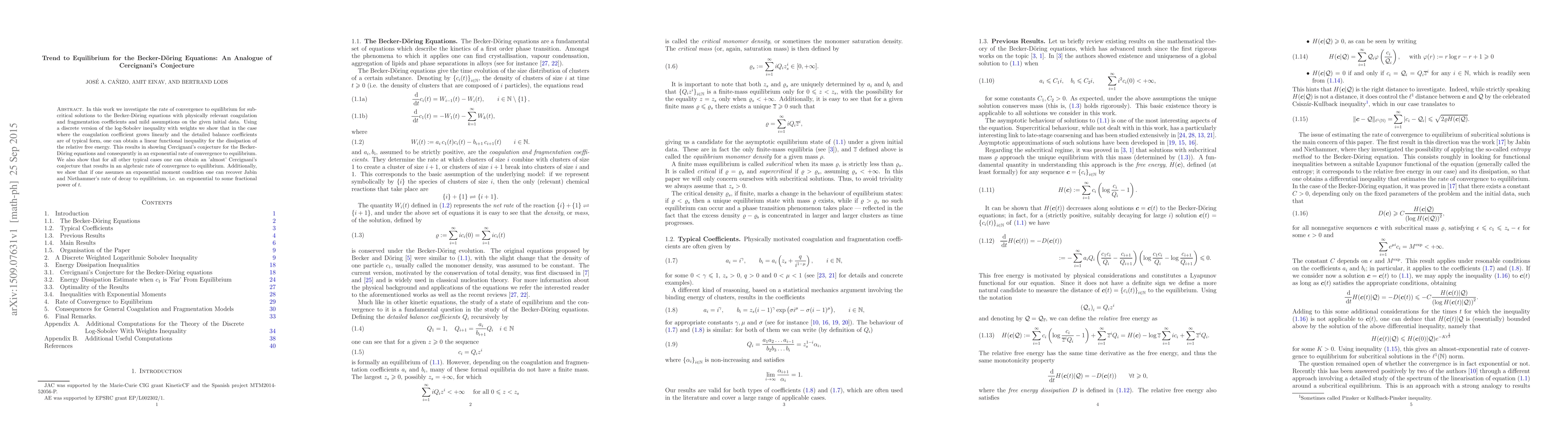 This paper explores the convergence rate to equilibrium for the Becker-Döring equations, proving Cercignani's conjecture under specific conditions, leading to exponential convergence, and demonstrating 'almost' Cercignani's conjecture for other cases, resulting in algebraic convergence.