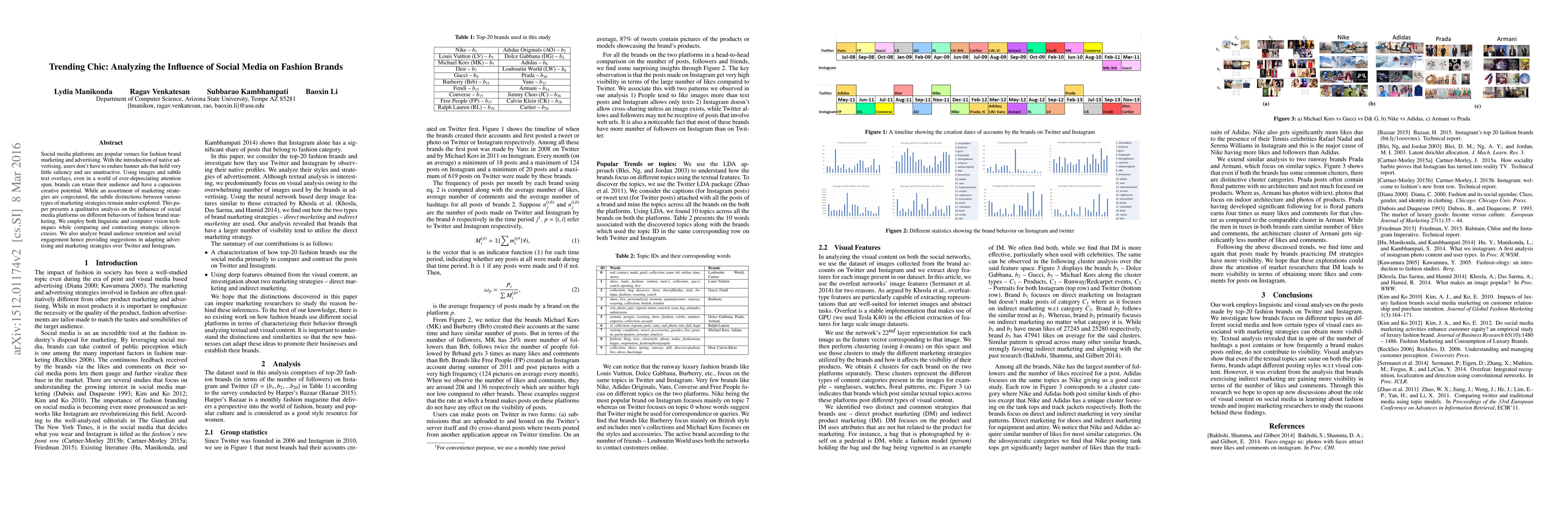 Social media platforms are popular venues for fashion brand marketing and advertising. With the introduction of native advertising, users don't have to endure banner ads that hold very little saliency and are unattractive. Using images and subtle text overlays, even in a world of ever-depreciating attention span, brands can retain their audience and have a capacious creative potential. While an assortment of marketing strategies are conjectured, the subtle distinctions between various types of marketing strategies remain under-explored. This paper presents a qualitative analysis on the influence of social media platforms on different behaviors of fashion brand marketing. We employ both linguistic and computer vision techniques while comparing and contrasting strategic idiosyncrasies. We also analyze brand audience retention and social engagement hence providing suggestions in adapting advertising and marketing strategies over Twitter and Instagram.
