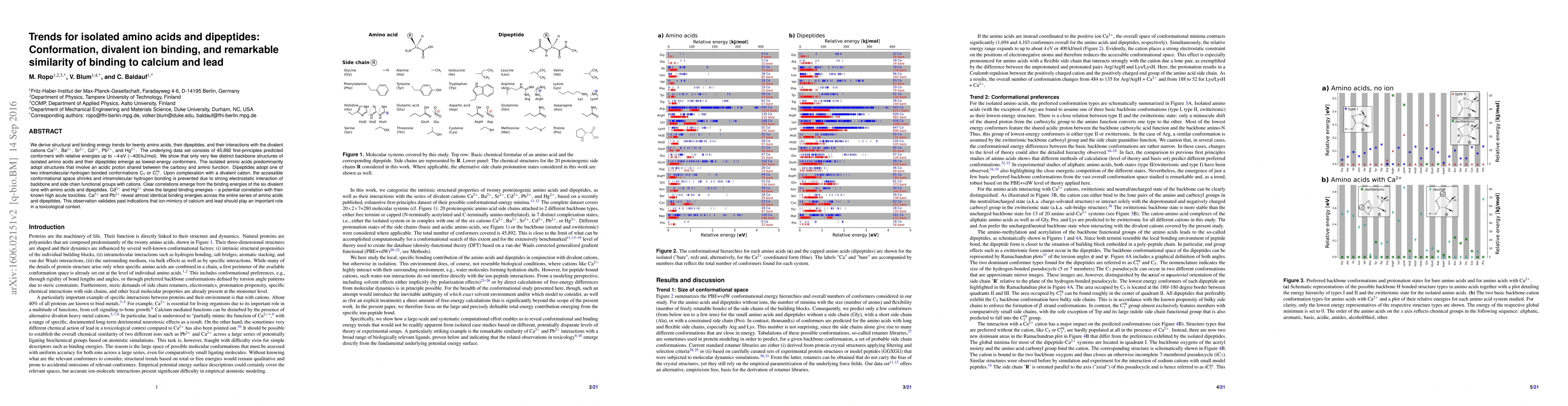 We derive structural and binding energy trends for twenty amino acids, their dipeptides, and their interactions with the divalent cations Ca$^{2+}$, Ba$^{2+}$, Sr$^{2+}$, Cd$^{2+}$, Pb$^{2+}$, and Hg$^{2+}$. The underlying data set consists of 45,892 first-principles predicted conformers with relative energies up to about 4 eV (about 400kJ/mol). We show that only very few distinct backbone structures of isolated amino acids and their dipeptides emerge as lowest-energy conformers. The isolated amino acids predominantly adopt structures that involve an acidic proton shared between the carboxy and amino function. Dipeptides adopt one of two intramolecular-hydrogen bonded conformations C$_5$ or equatorial C$_7$. Upon complexation with a divalent cation, the accessible conformational space shrinks and intramolecular hydrogen bonding is prevented due to strong electrostatic interaction of backbone and side chain functional groups with cations. Clear correlations emerge from the binding energies of the six divalent ions with amino acids and dipeptides. Cd$^{2+}$ and Hg$^{2+}$ show the largest binding energies - a potential correlation with their known high acute toxicities. Ca$^{2+}$ and Pb$^{2+}$ reveal almost identical binding energies across the entire series of amino acids and dipeptides. This observation validates past indications that ion-mimicry of calcium and lead should play an important role in a toxicological context.