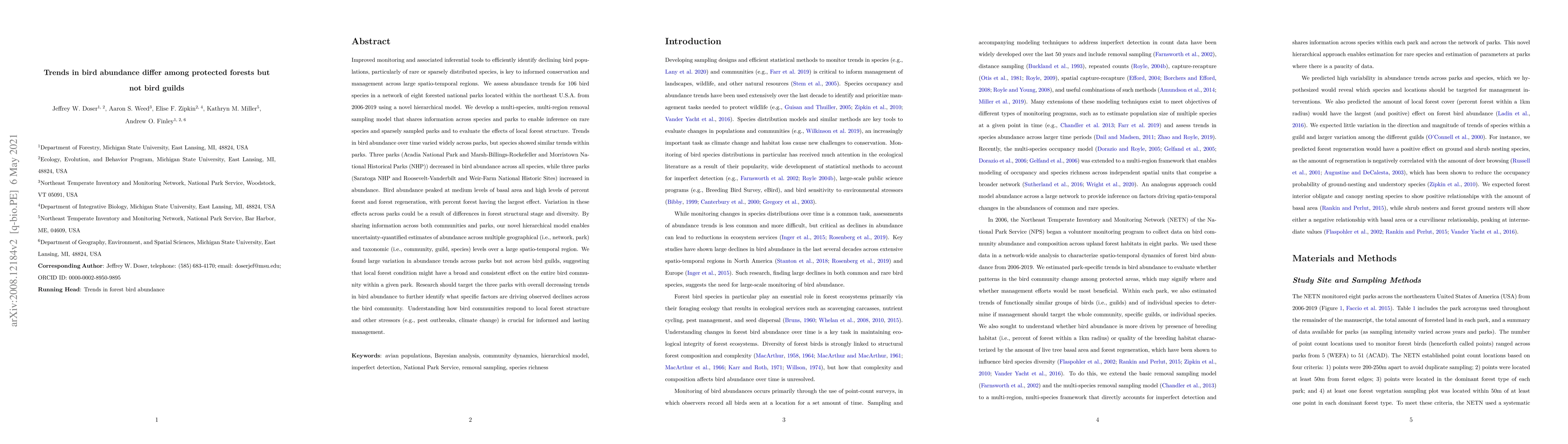 Improved monitoring and associated inferential tools to efficiently identify declining bird populations, particularly of rare or sparsely distributed species, is key to informed conservation and management across large spatio-temporal regions. We assess abundance trends for 106 bird species in a network of eight national park forests located within the northeast USA from 2006-2019 using a novel hierarchical model. We develop a multi-species, multi-region removal sampling model that shares information across species and parks to enable inference on rare species and sparsely sampled parks and to evaluate the effects of local forest structure. Trends in bird abundance over time varied widely across parks, but species showed similar trends within parks. Three parks (Acadia, Marsh-Billings-Rockefeller, and Morristown) decreased in bird abundance across all species, while three parks (Saratoga, Roosevelt-Vanderbilt, and Weir-Farm) increased in abundance. Bird abundance peaked at medium levels of basal area and high levels of percent forest and forest regeneration, with percent forest having the largest effect. Variation in these effects across parks could be a result of differences in forest structural stage and diversity. Our novel hierarchical model enables estimates of abundance at the network, park, guild, and species levels. We found large variation in abundance trends across parks but not across bird guilds, suggesting that local forest condition may have a broad and consistent effect on the entire bird community within a given park. Management should target the three parks with overall decreasing trends in bird abundance to further identify what specific factors are driving observed declines across the bird community. Understanding how bird communities respond to local forest structure and other stressors is crucial for informed and lasting management.