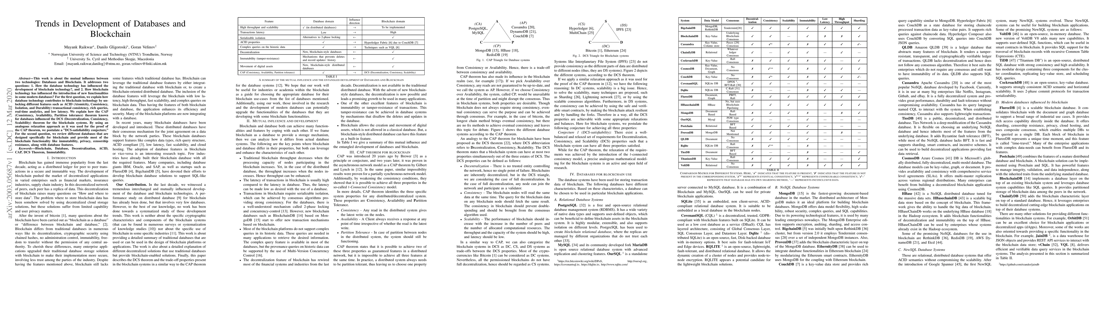 This work is about the mutual influence between two technologies: Databases and Blockchain. It addresses two questions: 1. How the database technology has influenced the development of blockchain technology?, and 2. How blockchain technology has influenced the introduction of new functionalities in some modern databases? For the first question, we explain how database technology contributes to blockchain technology by unlocking different features such as ACID (Atomicity, Consistency, Isolation, and Durability) transactional consistency, rich queries, real-time analytics, and low latency. We explain how the CAP (Consistency, Availability, Partition tolerance) theorem known for databases influenced the DCS (Decentralization, Consistency, Scalability) theorem for the blockchain systems. By using an analogous relaxation approach as it was used for the proof of the CAP theorem, we postulate a "DCS-satisfiability conjecture." For the second question, we review different databases that are designed specifically for blockchain and provide most of the blockchain functionality like immutability, privacy, censorship resistance, along with database features.