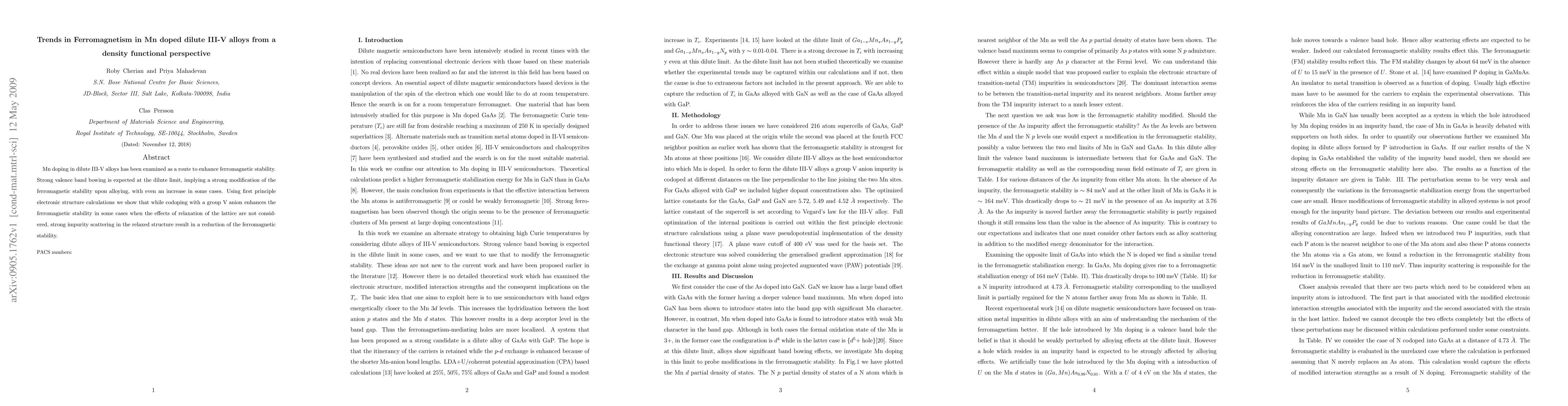 Mn doping in dilute III-V alloys has been examined as a route to enhance ferromagnetic stability. Strong valence band bowing is expected at the dilute limit, implying a strong modification of the ferromagnetic stability upon alloying, with even an increase in some cases. Using first principle electronic structure calculations we show that while codoping with a group V anion enhances the ferromagnetic stability in some cases when the effects of relaxation of the lattice are not considered, strong impurity scattering in the relaxed structure result in a reduction of the ferromagnetic stability.