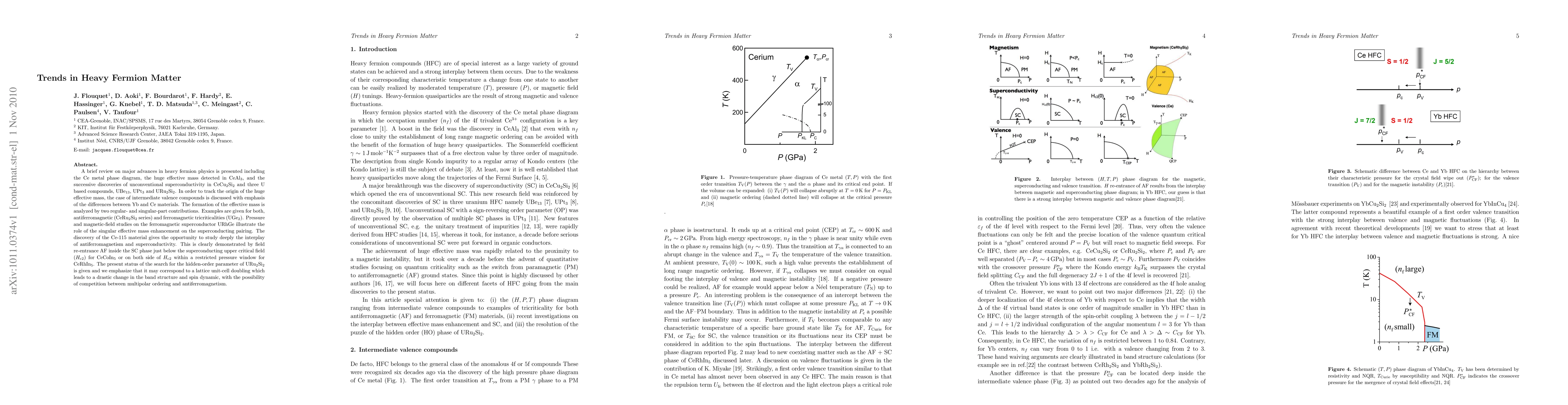 A brief review on major advances in heavy fermion physics is presented including the Ce metal phase diagram, the huge effective mass detected in CeAl3, and the successive discoveries of unconventional superconductivity in CeCu2Si2 and three U based compounds, UBe13, UPt3 and URu2Si2. In order to track the origin of the huge effective mass, the case of intermediate valence compounds is discussed with emphasis of the differences between Yb and Ce materials. The formation of the effective mass is analyzed by two regular- and singular-part contributions. Examples are given for both, antiferromagnetic (CeRu2Si2 series) and ferromagnetic tricriticalities (UGe2). Pressure and magnetic-field studies on the ferromagnetic superconductor URhGe illustrate the role of the singular effective mass enhancement on the superconducting pairing. The discovery of the Ce-115 material gives the opportunity to study deeply the interplay of antiferromagnetism and superconductivity. This is clearly demonstrated by field re-entrance AF inside the SC phase just below the superconducting upper critical field (Hc2) for CeCoIn5 or on both side of Hc2 within a restricted pressure window for CeRhIn5. The present status of the search for the hidden-order parameter of URu2Si2 is given and we emphasize that it may correspond to a lattice unit-cell doubling which leads to a drastic change in the band structure and spin dynamic, with the possibility of competition between multipolar ordering and antiferromagnetism.