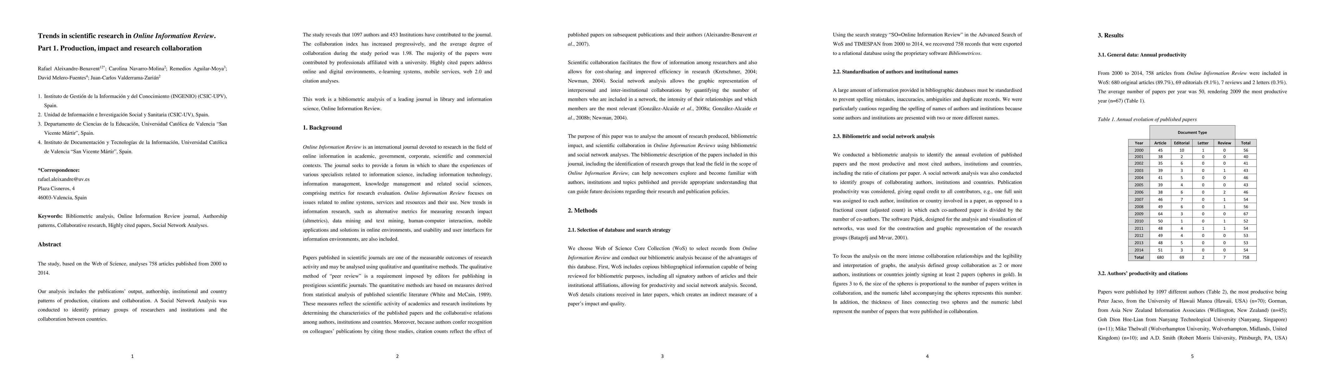 The study analyzed 758 articles published in Online Information Review from 2000 to 2014 using the Web of Science, examining production, impact, and research collaboration through metrics such as output, authorship, institutional patterns, citations, and collaboration networks.