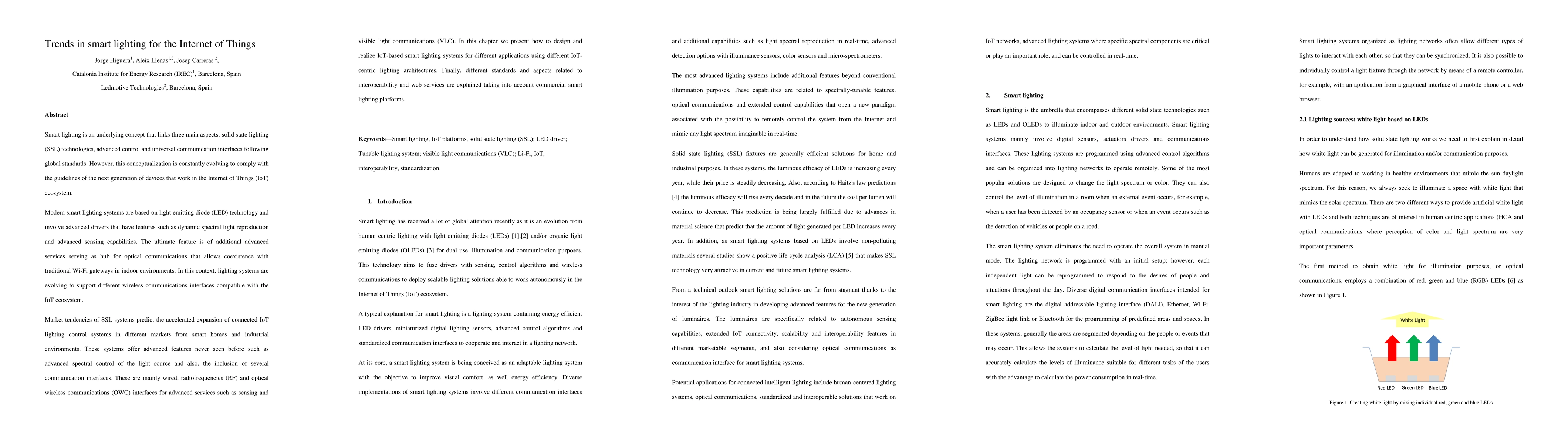 Smart lighting is an underlying concept that links three main aspects: solid-state lighting (SSL) technologies, advanced control and universal communication interfaces following global standards. However, this conceptualization is constantly evolving to comply with the guidelines of the next generation of devices that work in the Internet of Things (IoT) ecosystem. Modern smart lighting systems are based on light emitting diode (LED) technology and involve advanced drivers that have features such as dynamic spectral light reproduction and advanced sensing capabilities. The ultimate feature is of additional advanced services serving as the hub for optical communications that allows coexistence with traditional Wi-Fi gateways in indoor environments. In this context, lighting systems are evolving to support different wireless communications interfaces compatible with the IoT ecosystem. Market tendencies of SSL systems predict the accelerated expansion of connected IoT lighting control systems in different markets from smart homes and industrial environments. These systems offer advanced features never seen before such as advanced spectral control of the light source and also, the inclusion of several communication interfaces. These are mainly wired, radiofrequencies (RF) and optical wireless communications (OWC) interfaces for advanced services such as sensing and visible light communications (VLC). In this paper we present how to design and realize IoT-based smart lighting systems for different applications using different IoT-centric lighting architectures. Finally, different standards and aspects related to interoperability and web services are explained taking into account commercial smart lighting platforms.