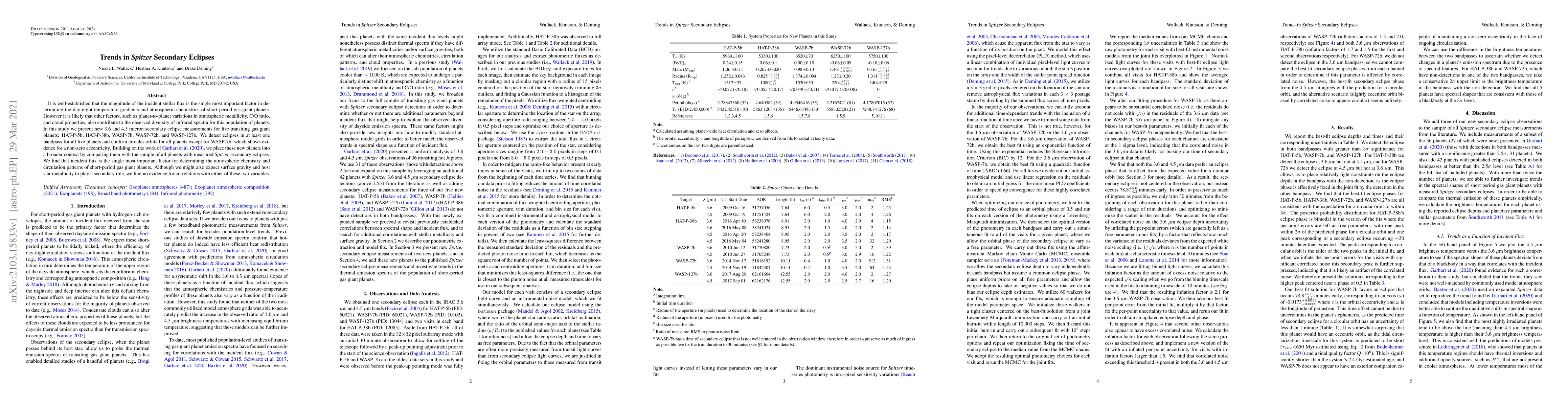 This study presents new Spitzer secondary eclipse measurements at 3.6 and 4.5 microns for five transiting gas giants, confirming that incident stellar flux is the primary factor influencing their atmospheric chemistry and temperature gradients, with no significant correlation found with surface gravity or host star metallicity.