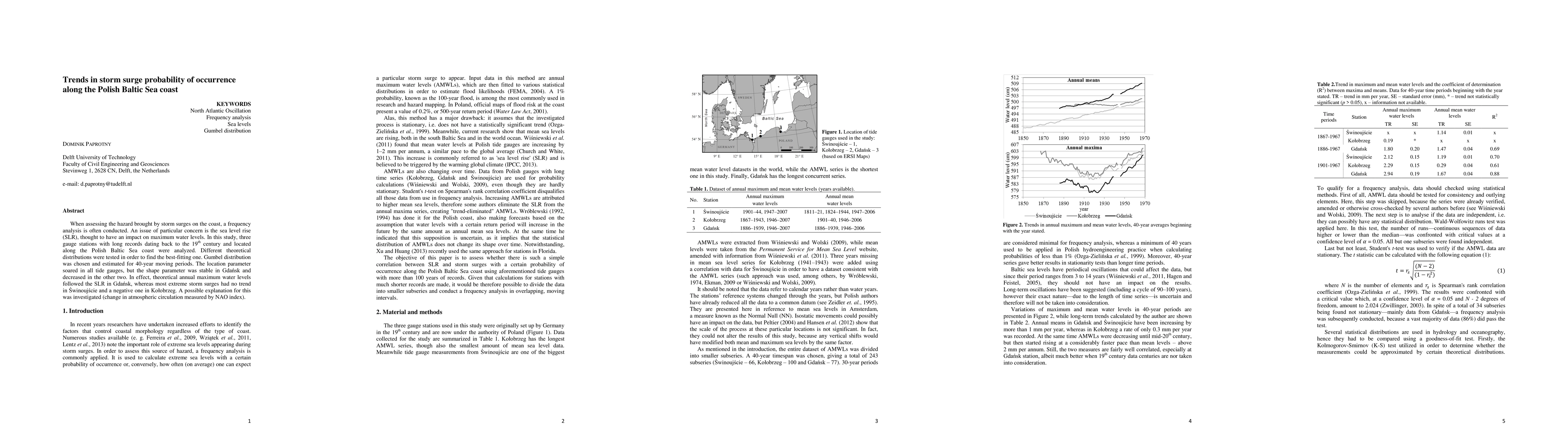 This study analyzes storm surge trends along the Polish Baltic Sea coast using three long-term tide gauge records. The Gumbel distribution was found to best fit the data, showing a rising location parameter indicating increasing maximum water levels, with varying trends in extreme storm surges potentially linked to changes in atmospheric circulation.