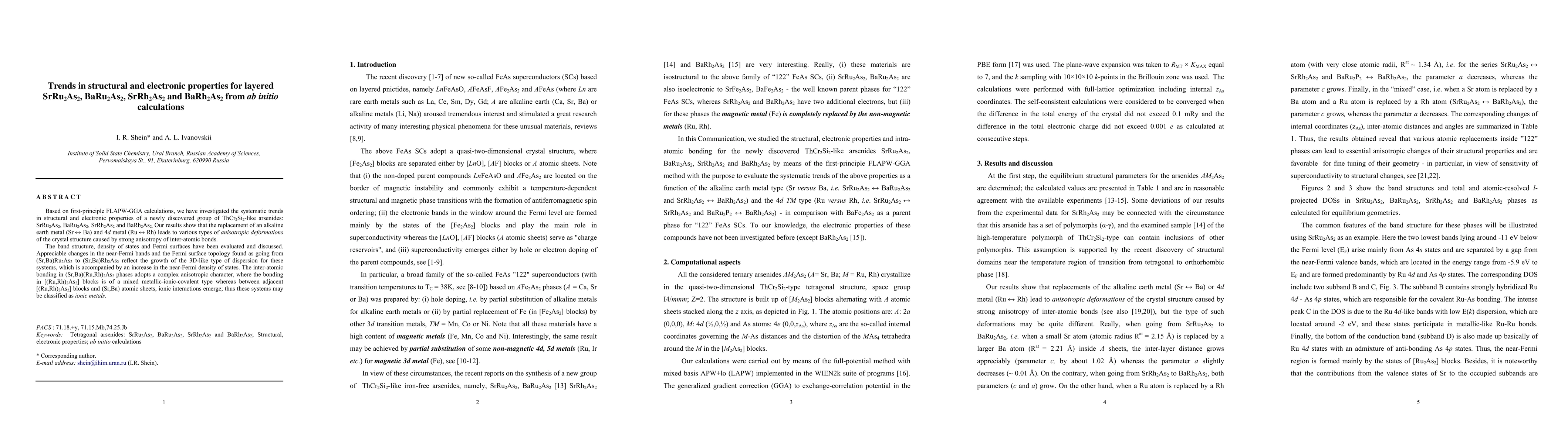 Based on first-principle FLAPW-GGA calculations, we have investigated the systematic trends in structural and electronic properties of a newly discovered group of ThCr2Si2-like arsenides: SrRu2As2, BaRu2As2, SrRh2As2 and BaRh2As2. Our results show that the replacement of an alkaline earth metal (Sr - Ba) and 4d metal (Ru - Rh) leads to various types of anisotropic deformations of the crystal structure caused by strong anisotropy of inter-atomic bonds. The band structure, density of states and Fermi surfaces have been evaluated and discussed. Appreciable changes in the near-Fermi bands and the Fermi surface topology found as going from (Sr,Ba)Ru2As2 to (Sr,Ba)Rh2As2 reflect the growth of the 3D-like type of dispersion for these systems, which is accompanied by an increase in the near-Fermi density of states. The inter-atomic bonding in (Sr,Ba)(Ru,Rh)2As2 phases adopts a complex anisotropic character, where the bonding in [(Ru,Rh)2As2] blocks is of a mixed metallic-ionic-covalent type whereas between adjacent [(Ru,Rh)2As2] blocks and (Sr,Ba) atomic sheets, ionic interactions emerge; thus these systems may be classified as ionic metals.