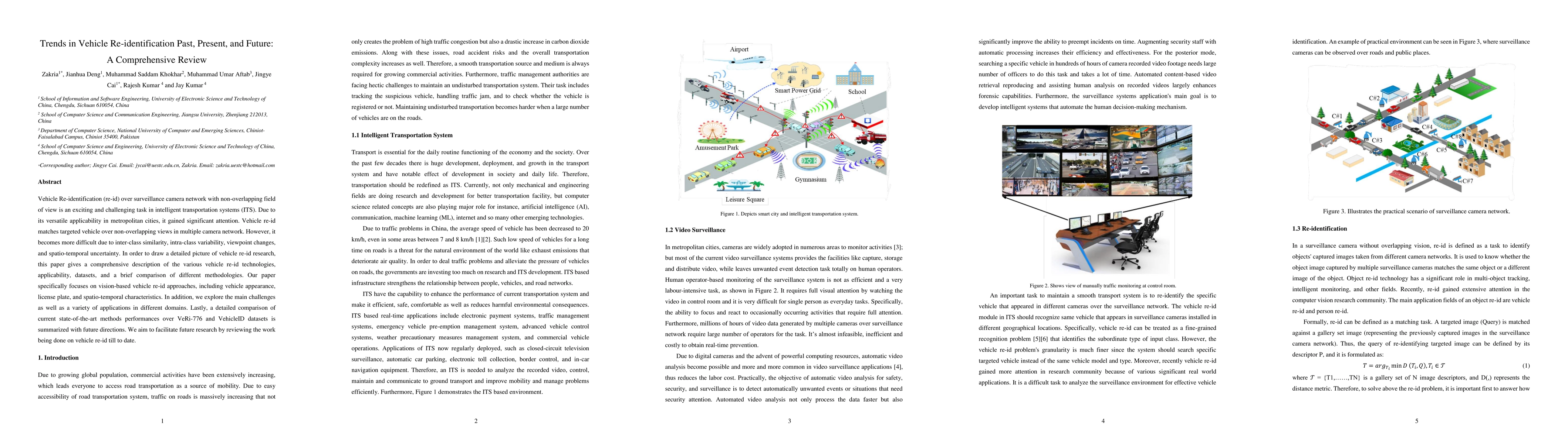 This paper provides a comprehensive review of vehicle re-identification technologies, focusing on vision-based approaches, challenges, and applications in intelligent transportation systems. It compares state-of-the-art methods and highlights future research directions to advance the field.