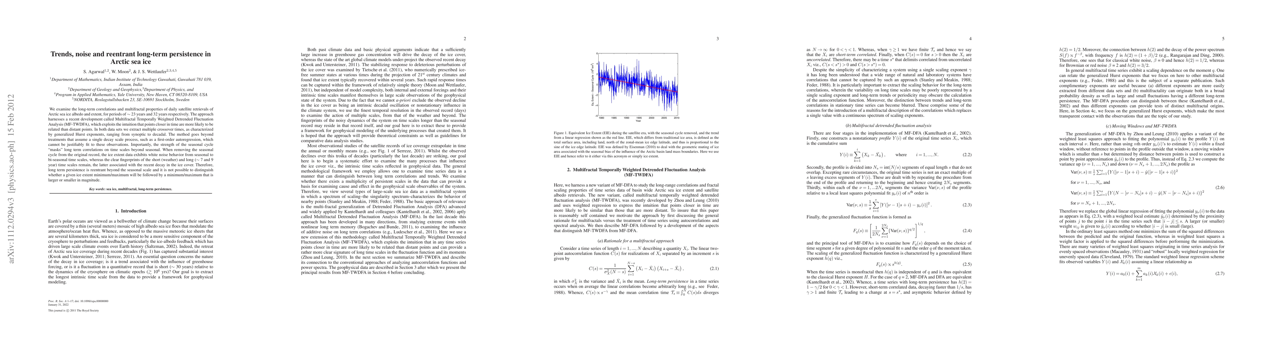 This study uses Multifractal Temporally Weighted Detrended Fluctuation Analysis to analyze Arctic sea ice data, revealing complex long-term correlations and multifractal properties. The analysis uncovers reentrant long-term persistence beyond seasonal cycles, indicating that while short-term weather patterns dominate, long-term trends are also significant, complicating predictions of future ice extent.