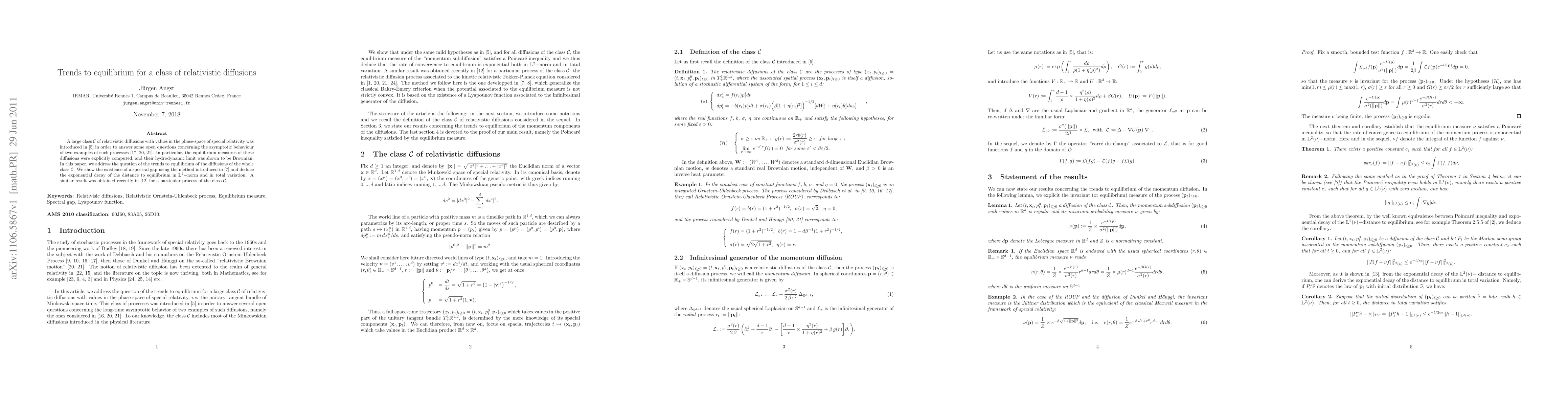 This paper studies a class of relativistic diffusions and shows that many processes in this class converge to equilibrium exponentially, with the distance to equilibrium decaying in both L2-norm and total variation.