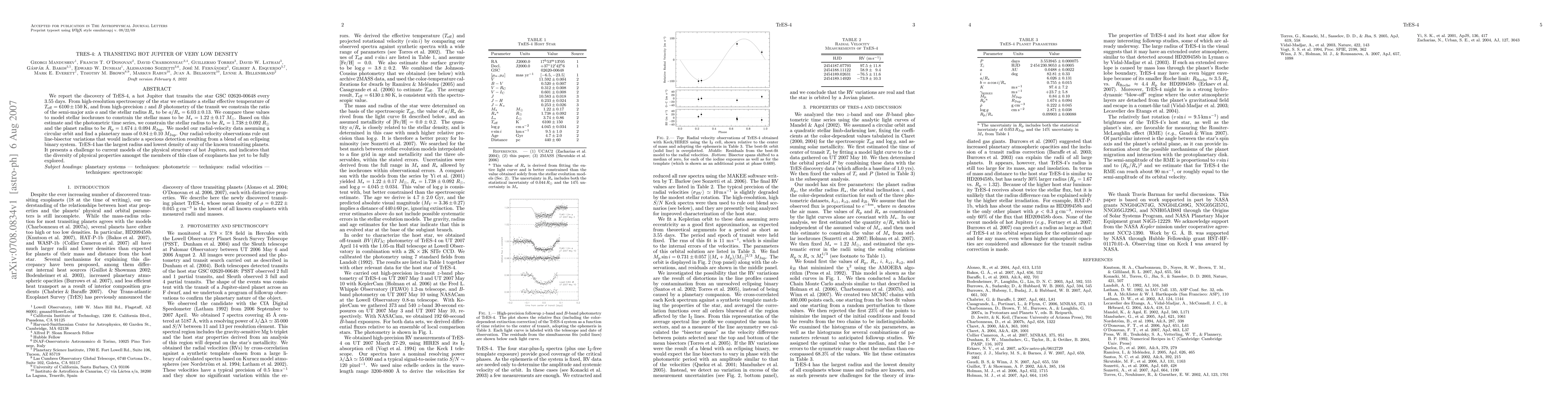 TrES-4 is a hot Jupiter transiting its star every 3.55 days, with a notably large radius and low density, challenging current models of hot Jupiters and indicating significant diversity in this exoplanet class. The planet's radius is 1.674 RJup, making it the least dense known transiting planet.